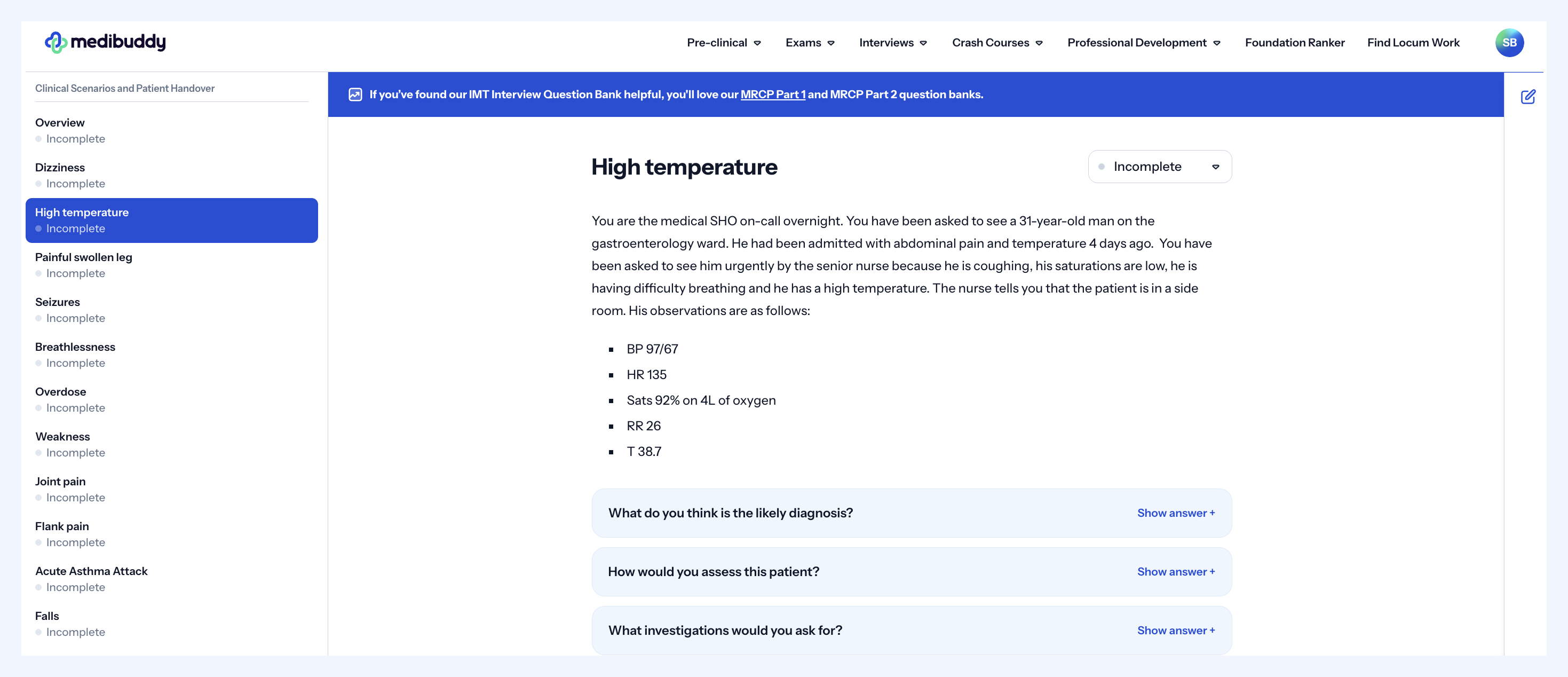 Spend time using interview question banks to identify areas of your knowledge that need a little more work. The Medibuddy IMT question bank includes scenarios written by previously high scoring IMT trainees covering all parts of the syllabus, and will help you prepare for the style of questions that will come up. Here is an example of a clinical scenario from our question bank.