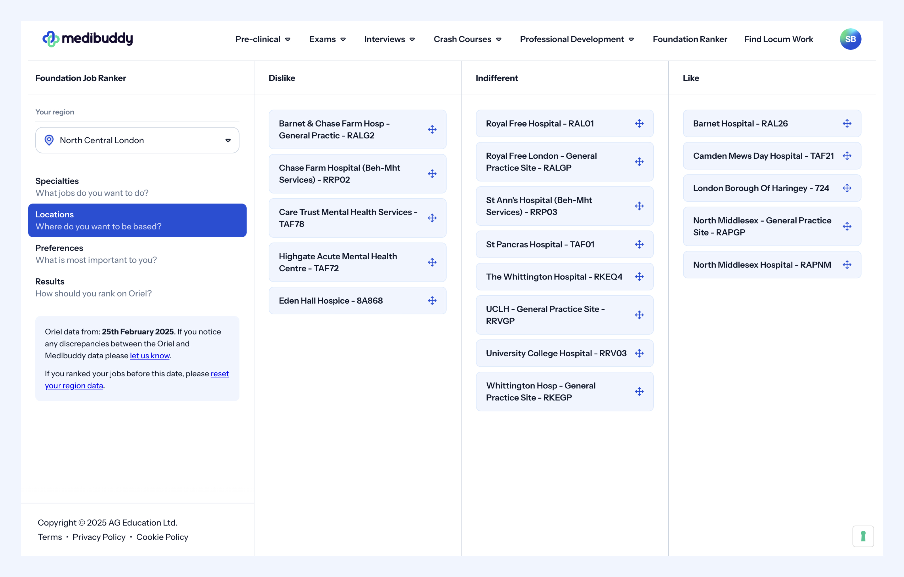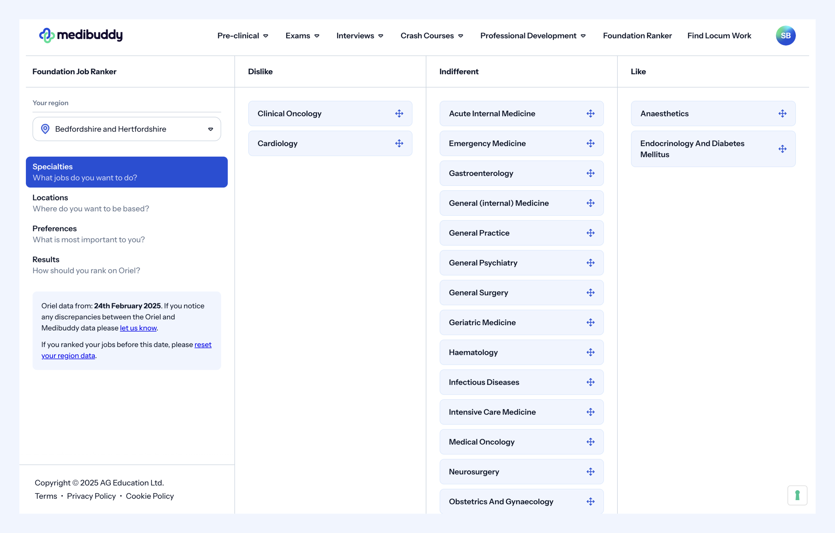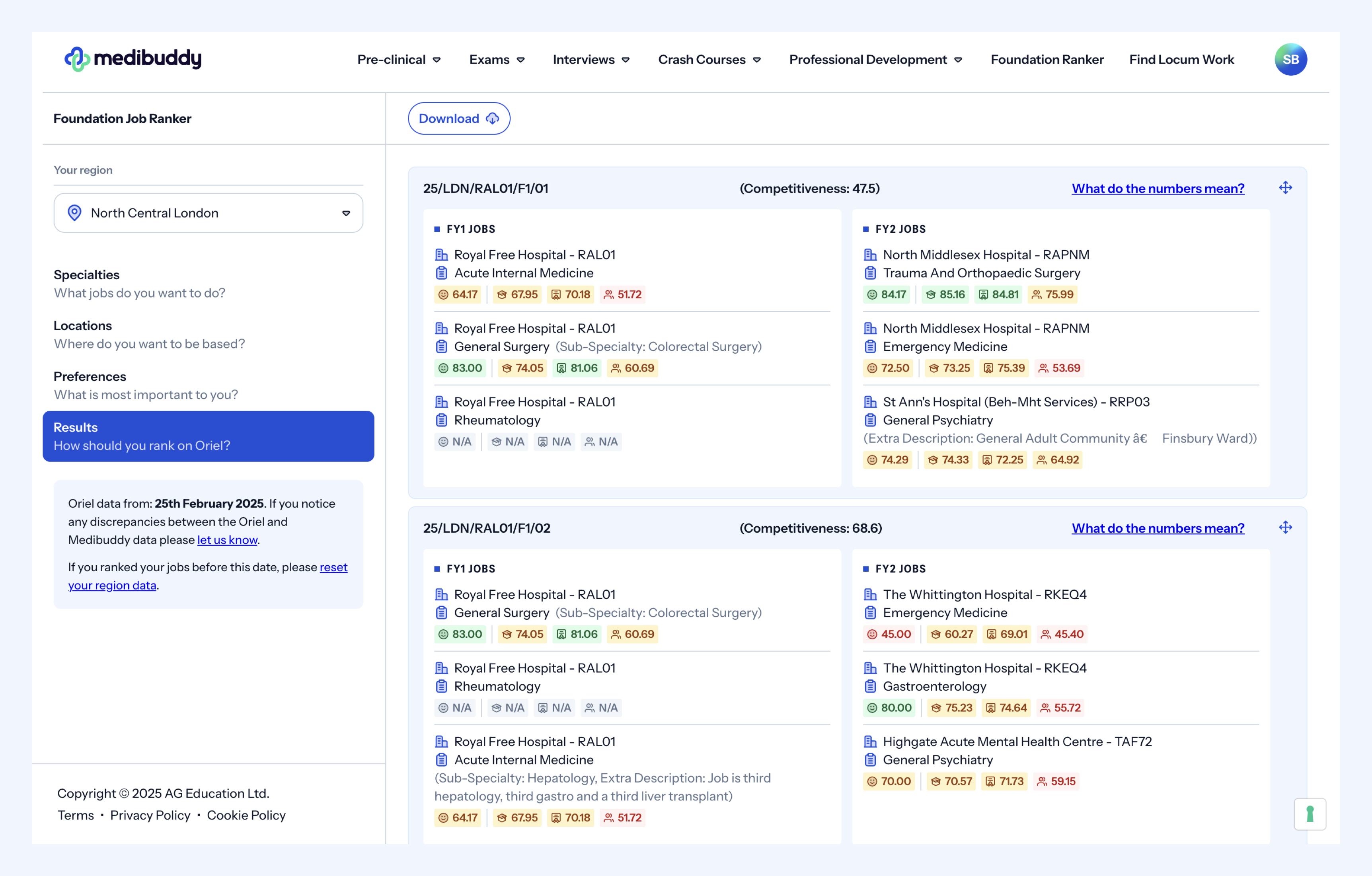 The Medibuddy foundation job ranker downloads the foundation jobs for your allocated foundation school directly from Oriel. This ensures that the job list in the foundation job ranker is identical to Oriel, making it simple for you to rank your choices easily in our system, before transferring them to Oriel.