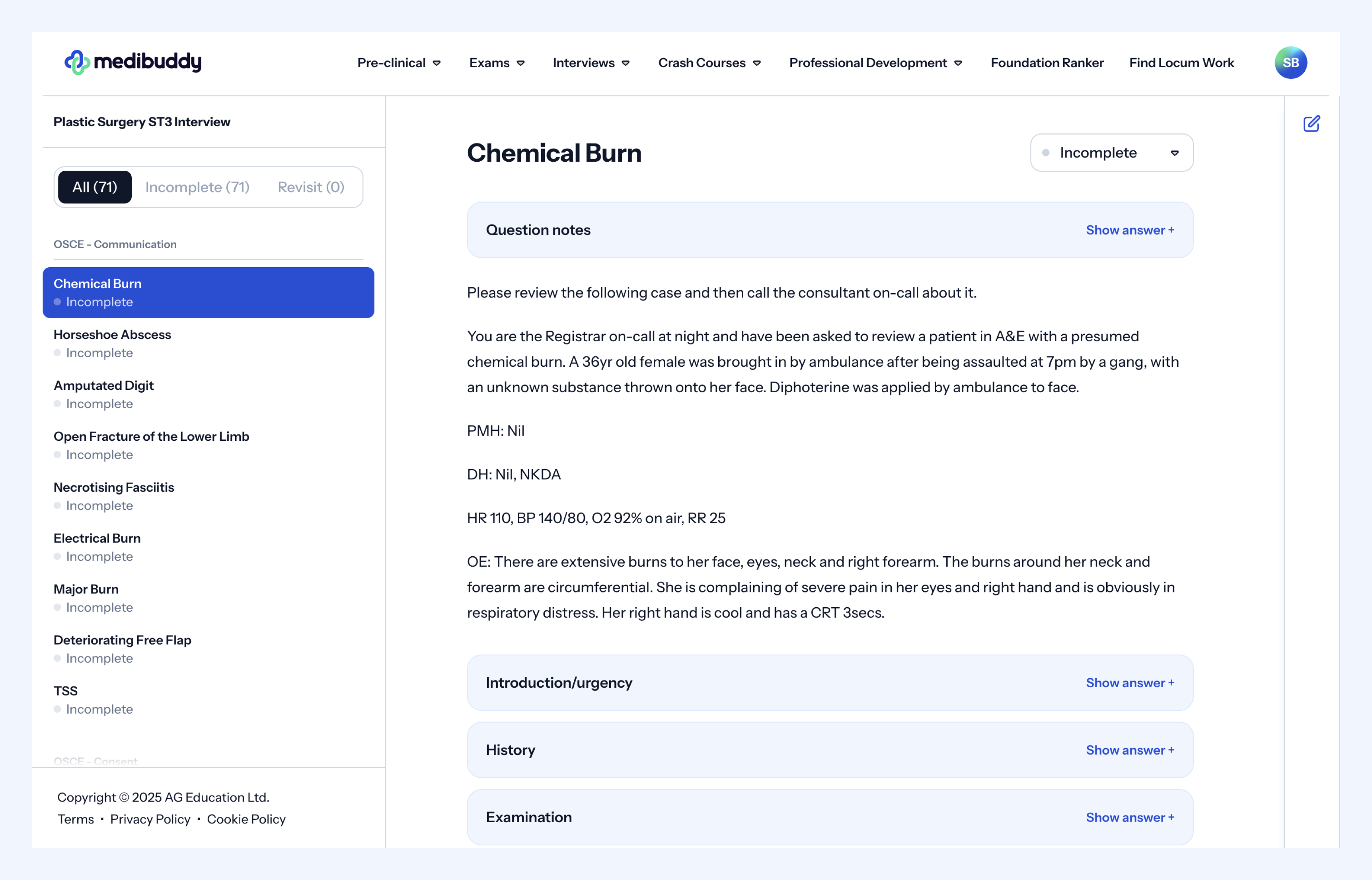 This part will also be 5 minutes. This station looks at your communication skills when calling consultants to discuss scenarios. There are only a limited number of plastic surgery emergencies, so it’s possible to prepare for them, and we have included these in our interview question bank. It is a good idea to record yourself when working through these practice scenarios, as you can then listen back and see where you need to improve your delivery. Here is an example of a chemical burn scenario from our interview question bank.