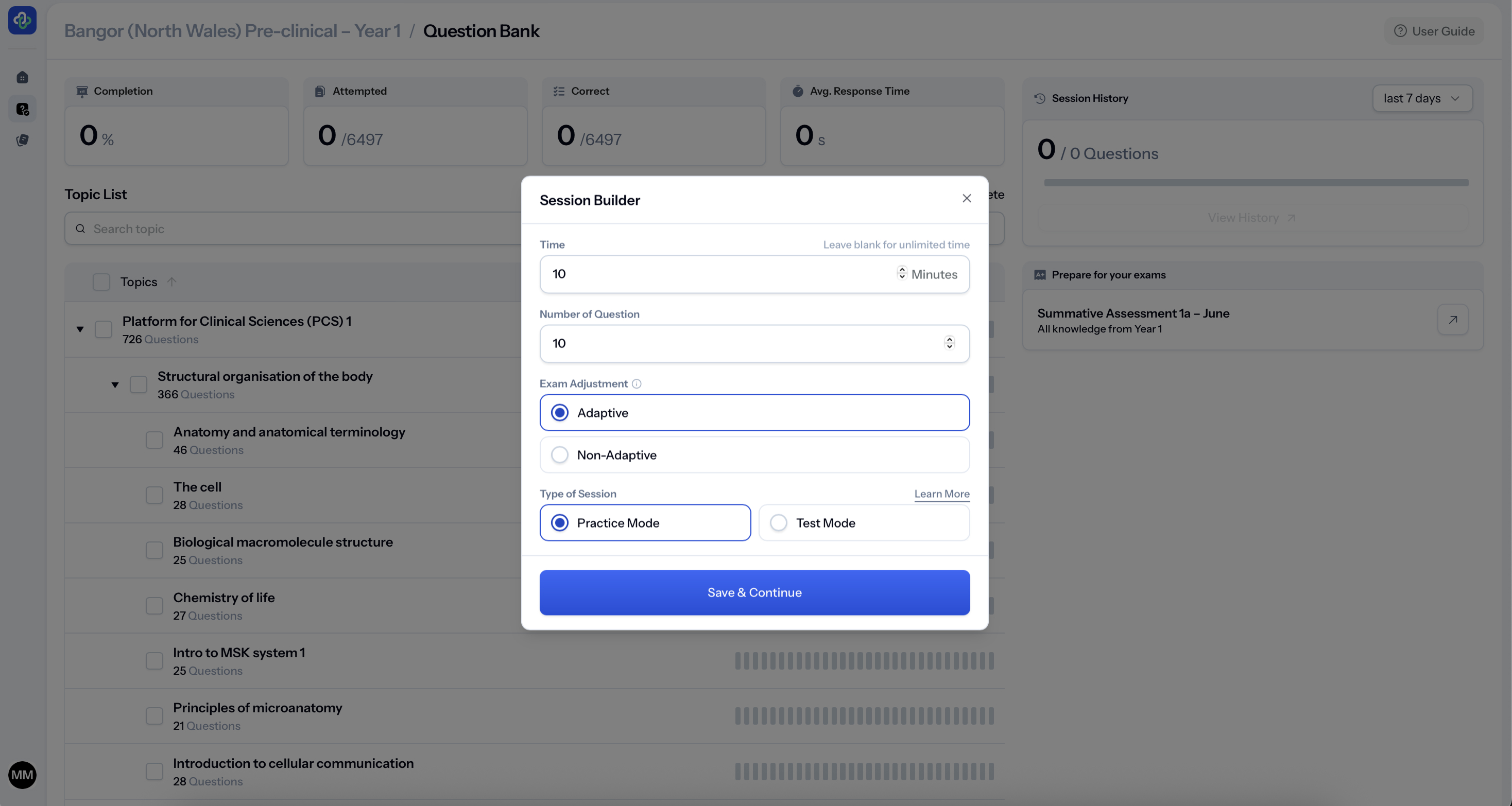 You can work module by module, choose how many questions you want to answer, and target specific topics as your exams approach.