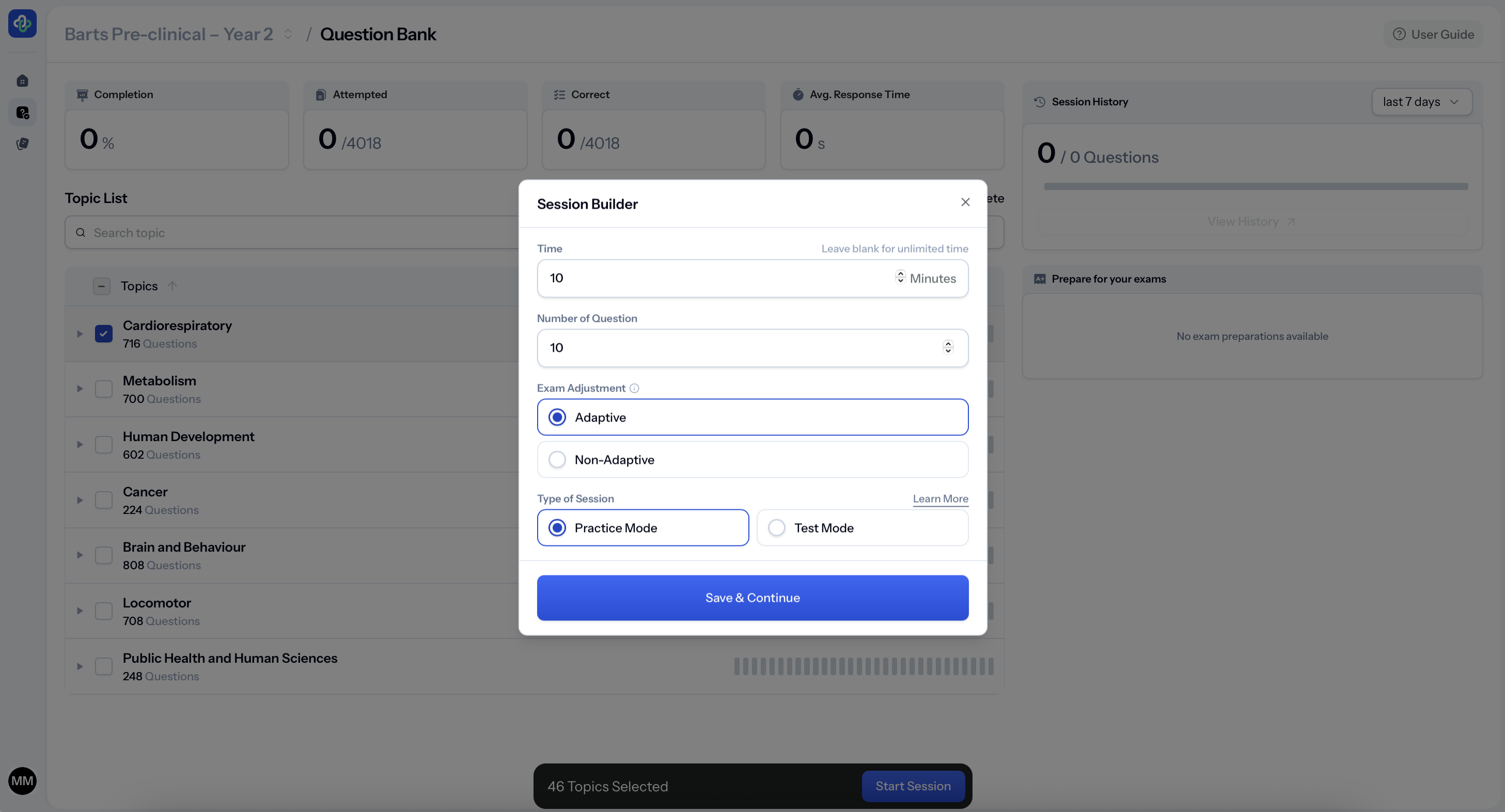 You can work module by module, choose how many questions you want to answer, and target specific topics as your exams approach.