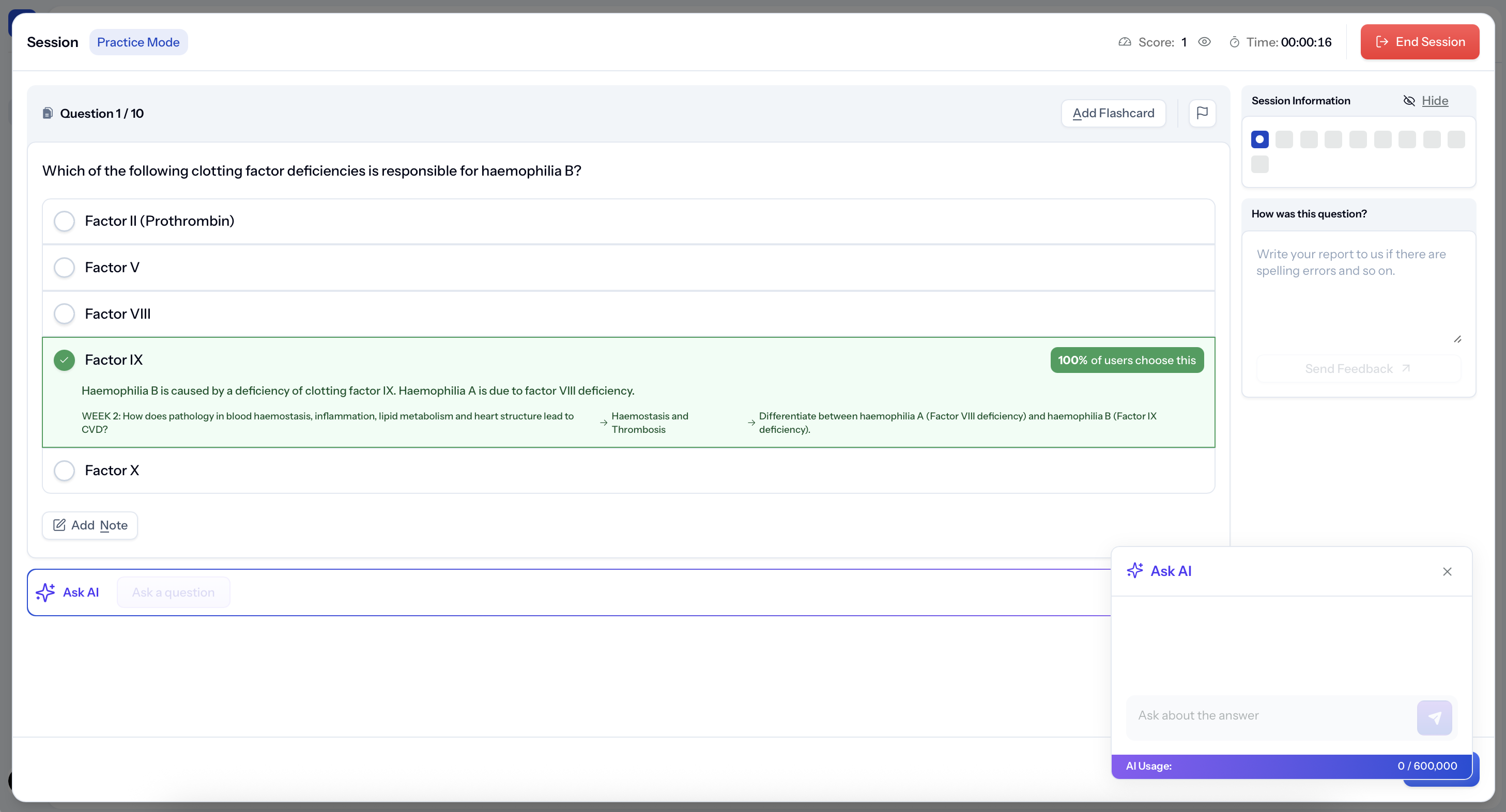 Medibuddy’s Year 2 Barts (Queen Mary London) Medical School Question Bank is designed around the second-year curriculum, with over 4,000 questions mapped directly to what you’ll be studying. Each question comes with a clear explanation to help you consolidate your understanding, address weaker areas, and monitor your progress.