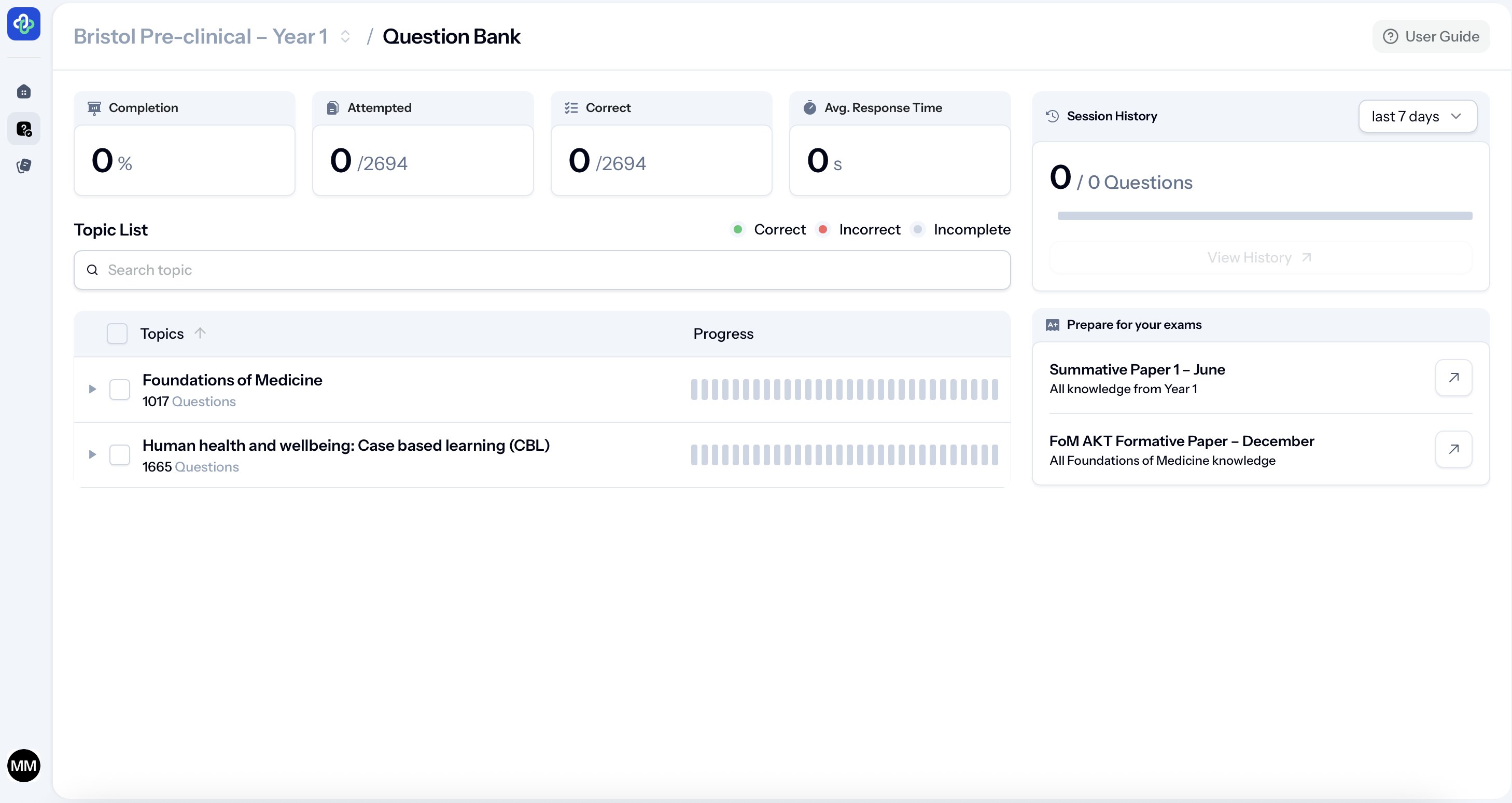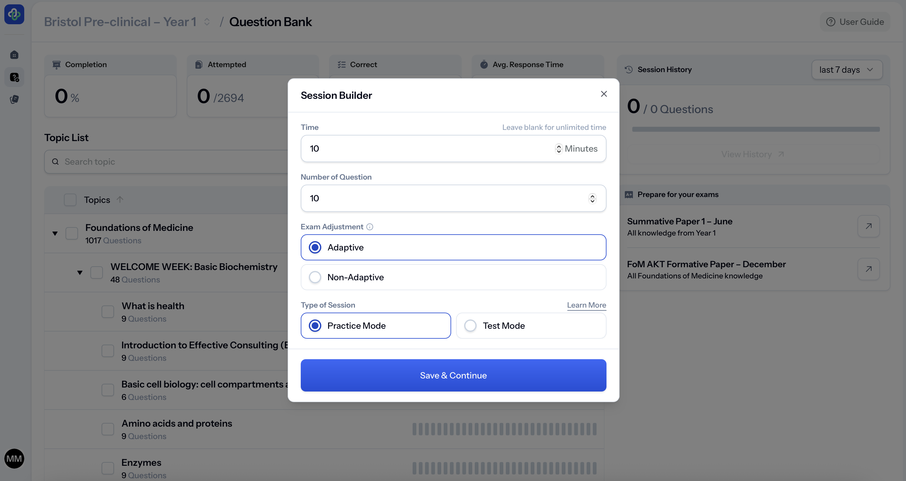 You can work module by module, choose how many questions you want to answer, and target specific topics as your exams approach.