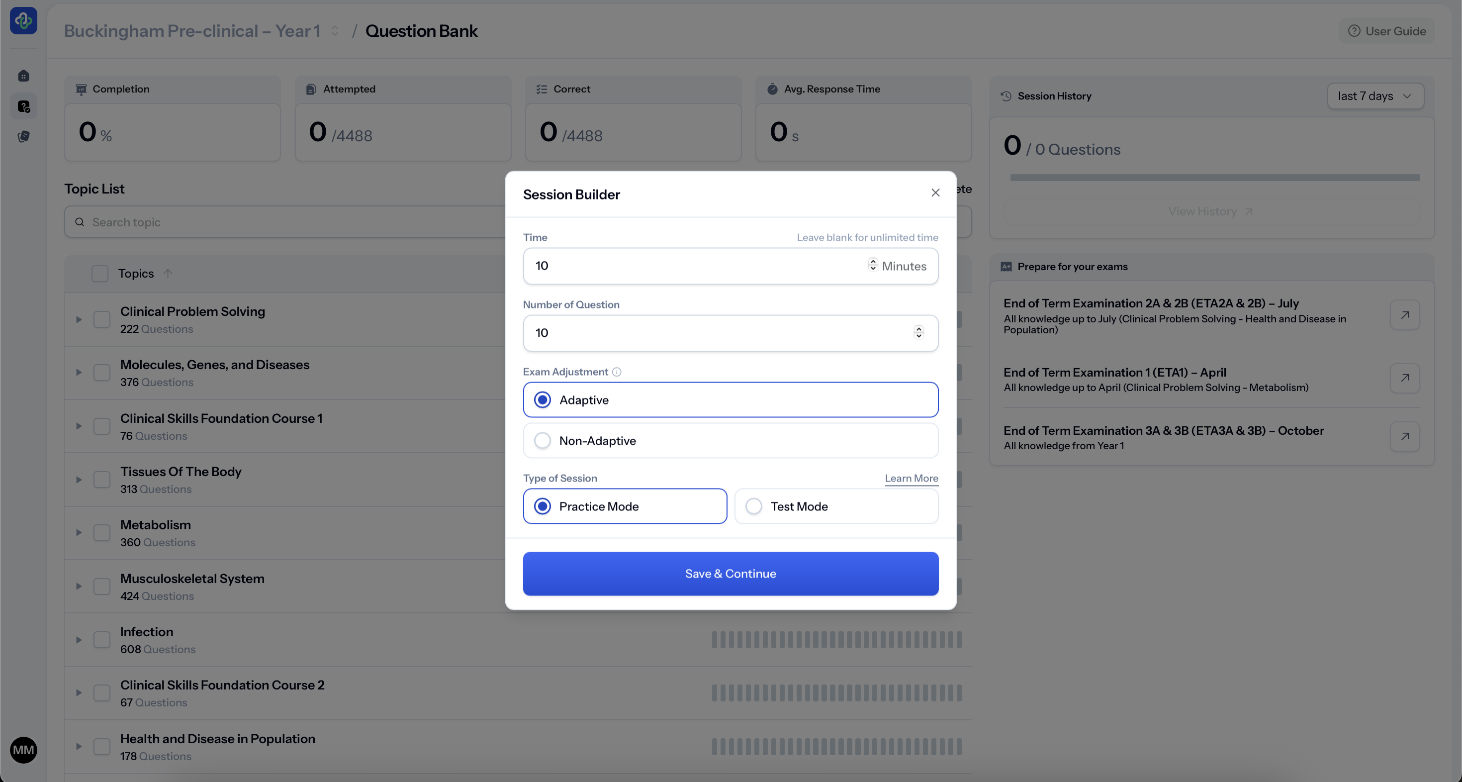 You can work module by module, choose how many questions you want to answer, and target specific topics as your exams approach.
