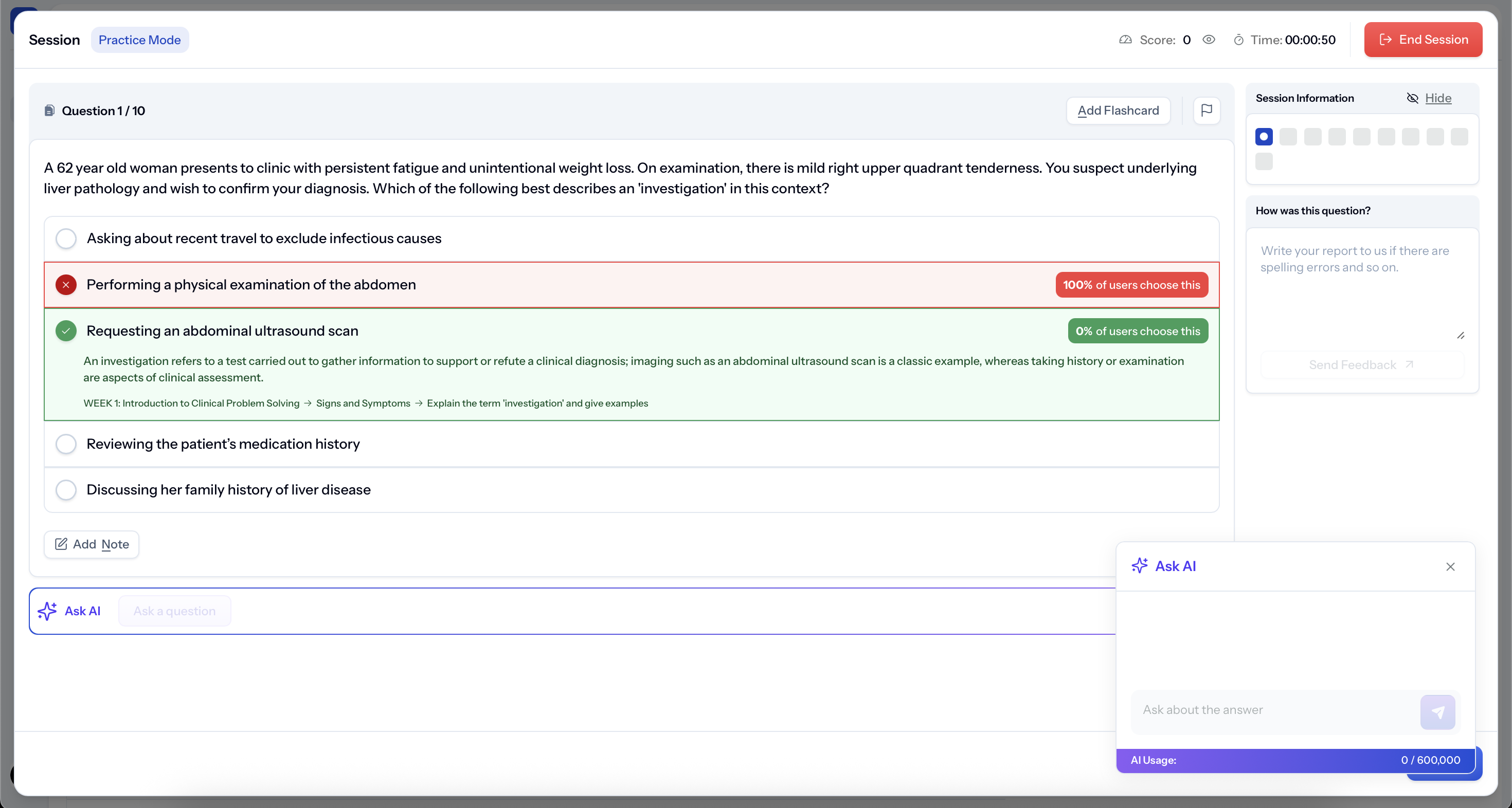 Medibuddy’s Year 1 Buckingham Question Bank is built around the Buckingham curriculum, with over 9,000 practice questions designed to match what you’re learning. Each question comes with clear explanations, helping you test your understanding and fill in any gaps as you progress.