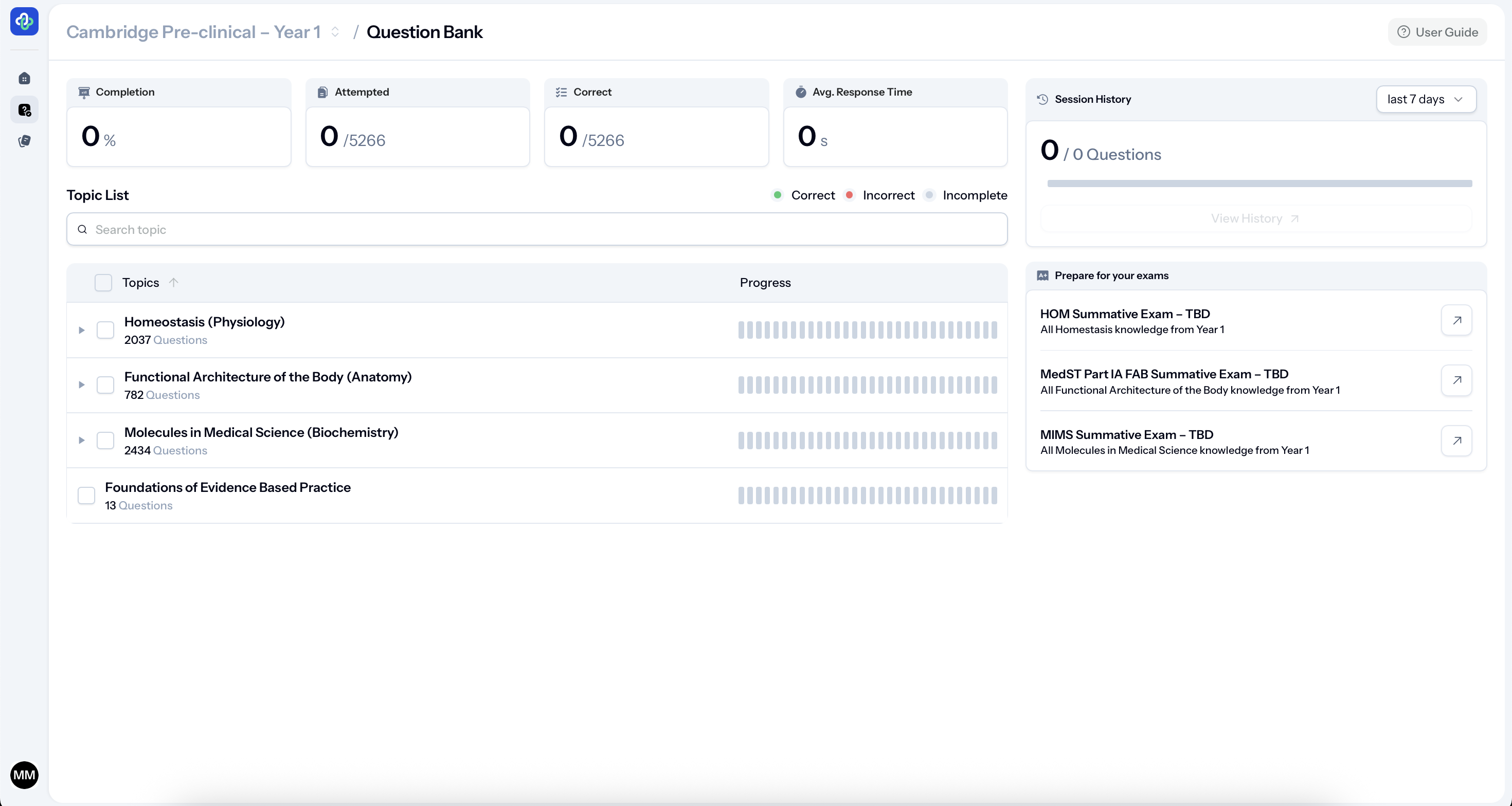 You can work module by module, choose how many questions you want to answer, and target specific topics as your exams approach.