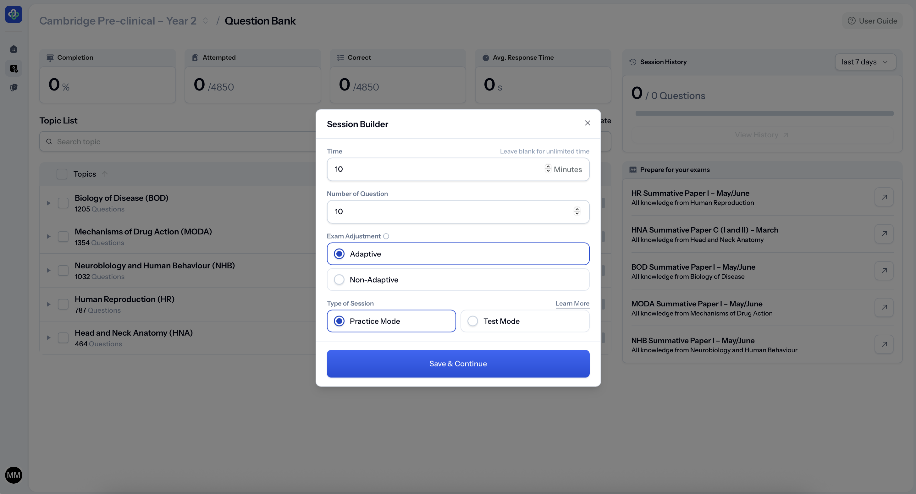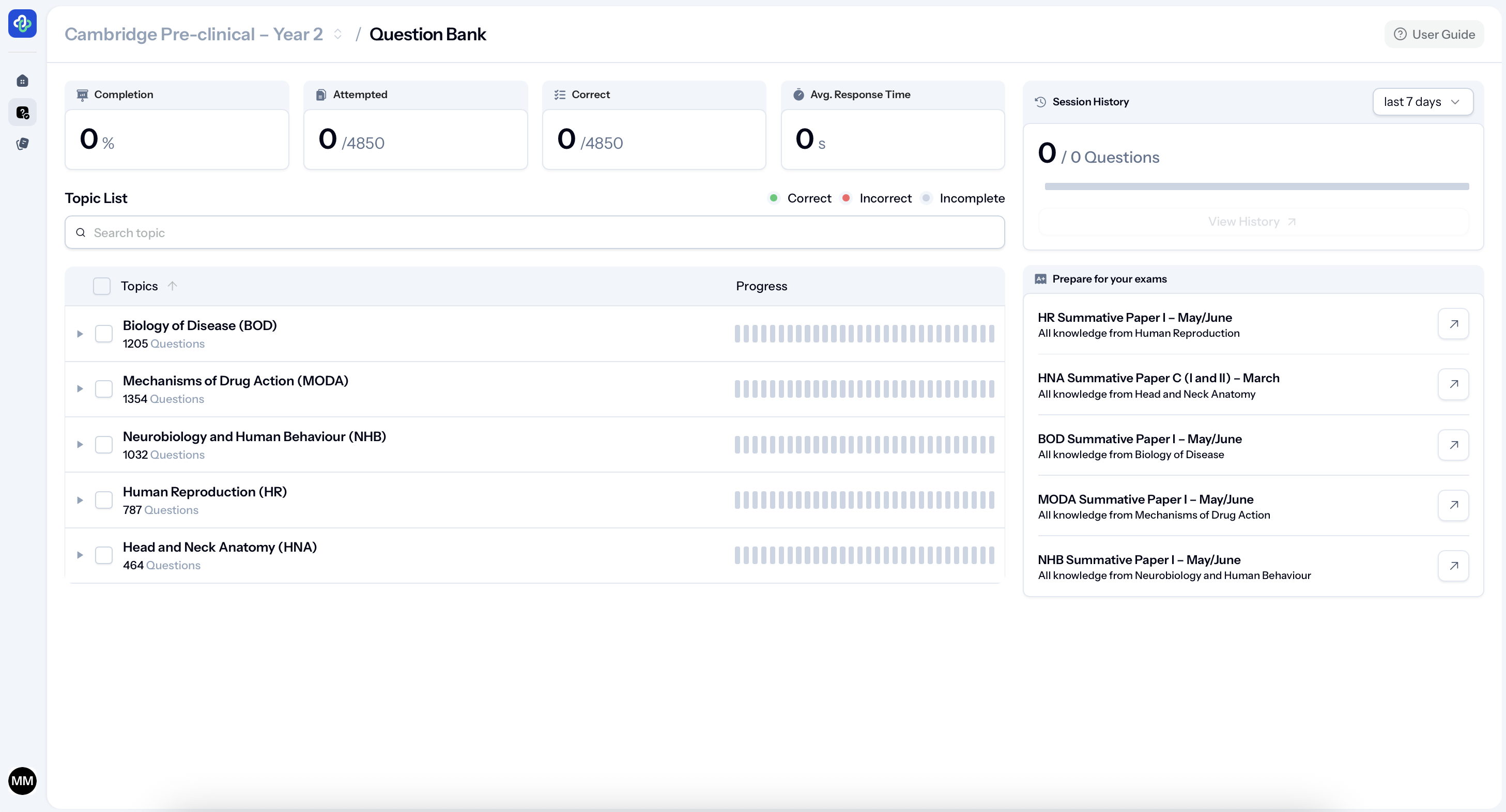 You can work module by module, choose how many questions you want to answer, and target specific topics as your exams approach.