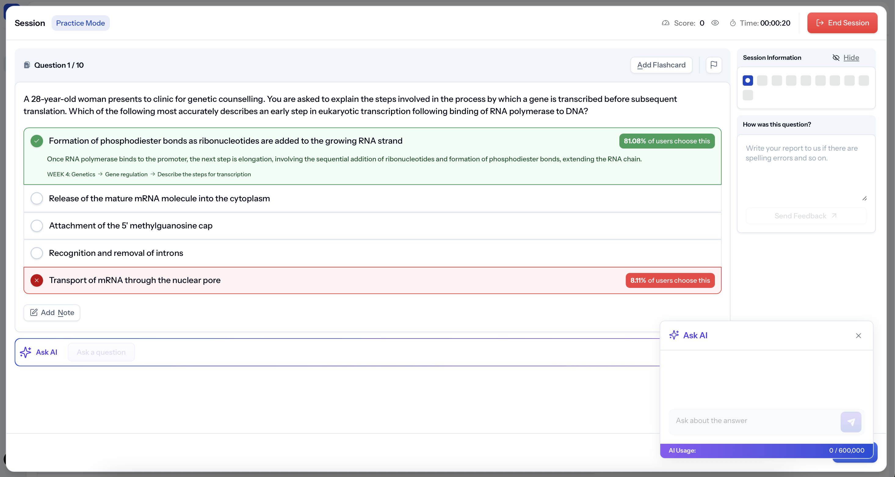 Medibuddy’s Year 1 Dundee Question Bank is designed around the Dundee curriculum, offering over 3,700 questions that reflect the subjects you’ll cover in your first year. Each comes with a straightforward explanation, making it easier to track your progress and focus on areas that need extra work.