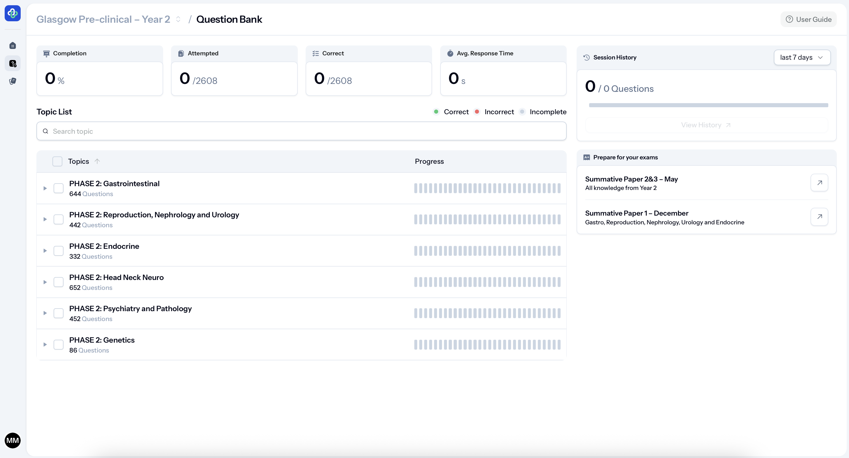 With more than 2,600 syllabus-aligned questions, Medibuddy’s Glasgow Year 2 Question Bank gives you the chance to practise exam-style questions, strengthen application of key concepts, and manage your revision time effectively across all modules.