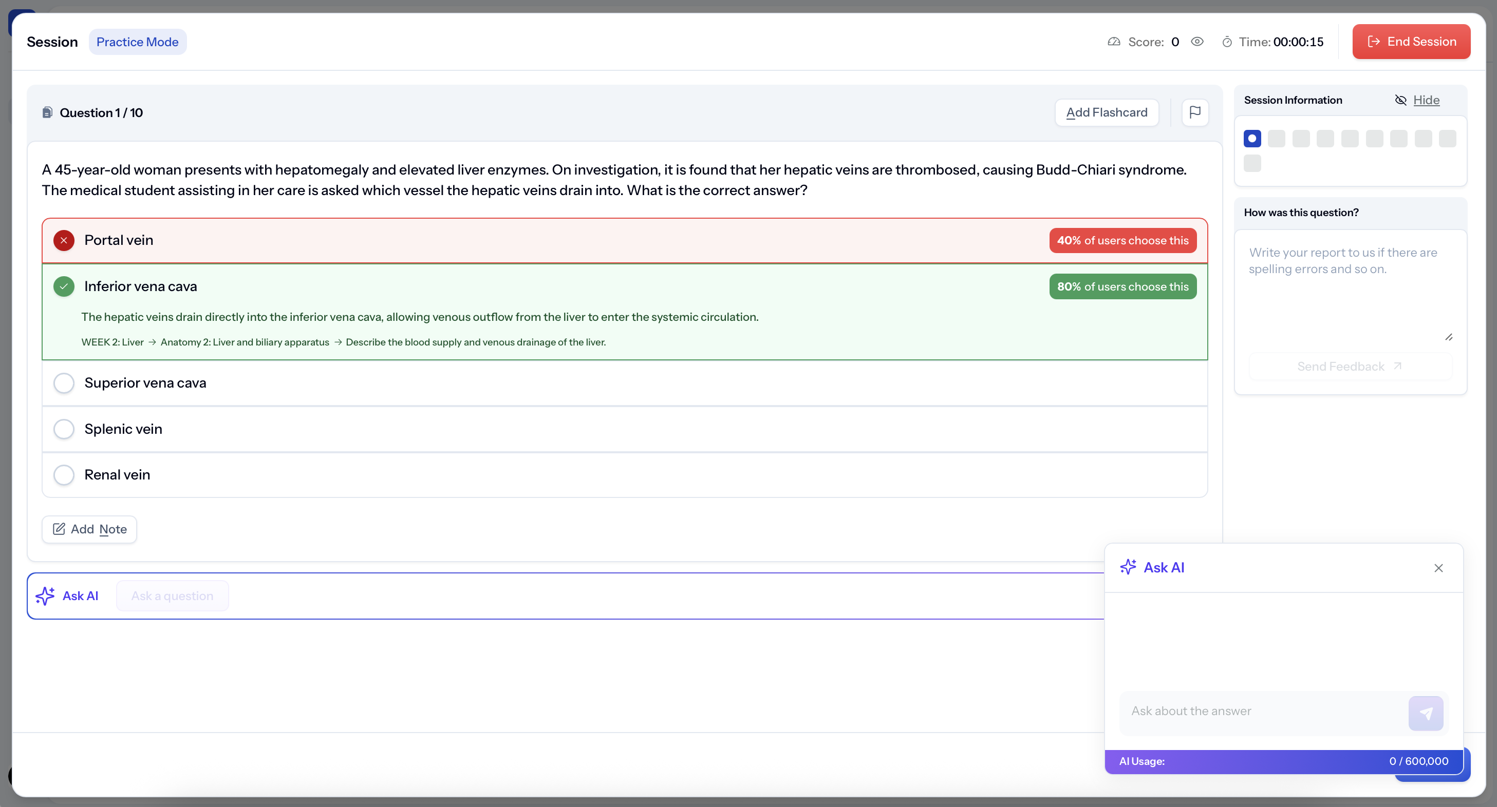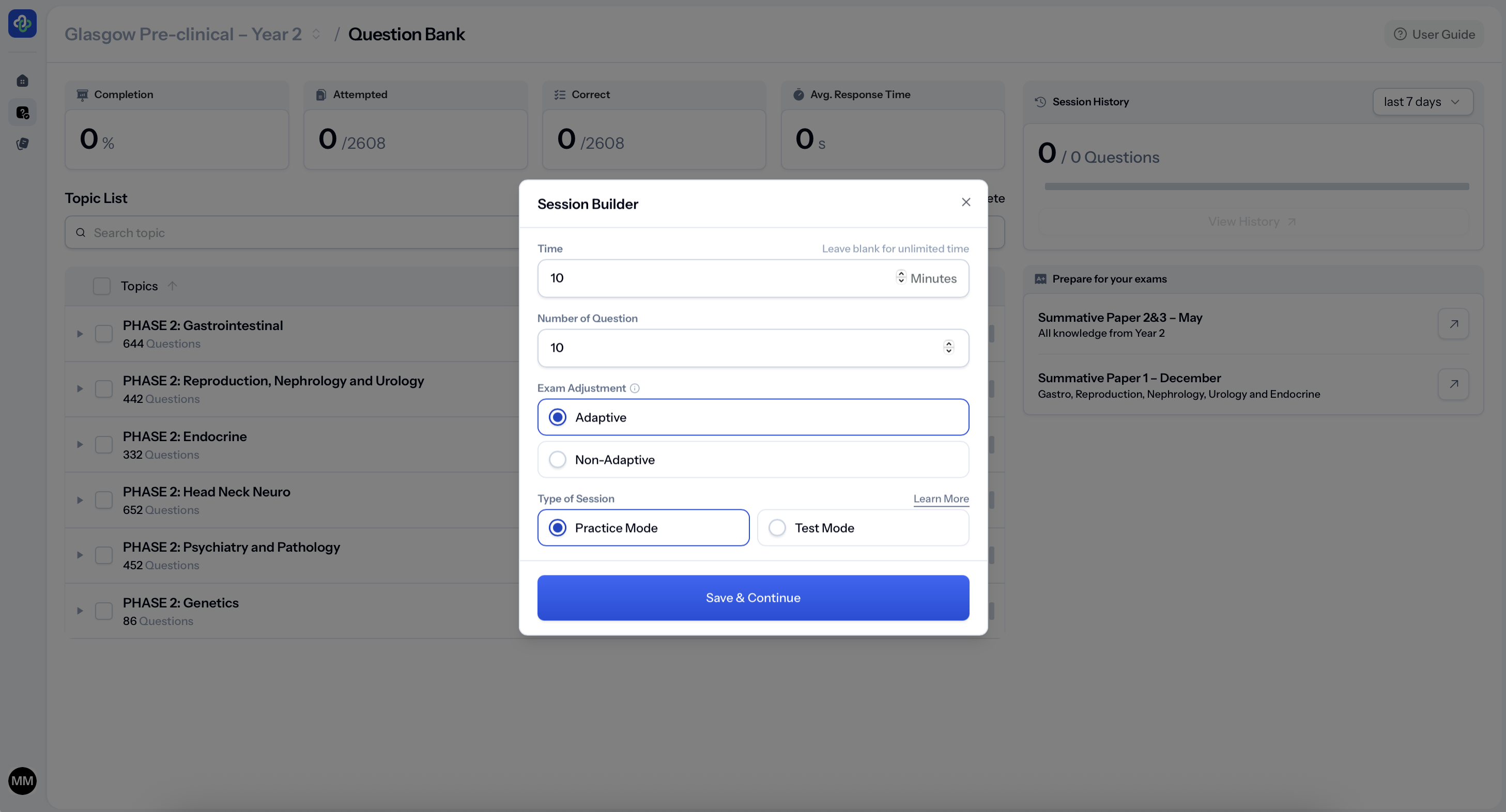 You can work module by module, choose how many questions you want to answer, and target specific topics as your exams approach.
