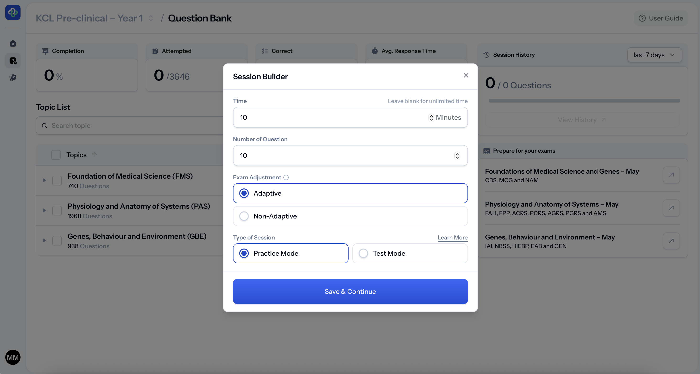 You can work module by module, choose how many questions you want to answer, and target specific topics as your exams approach.