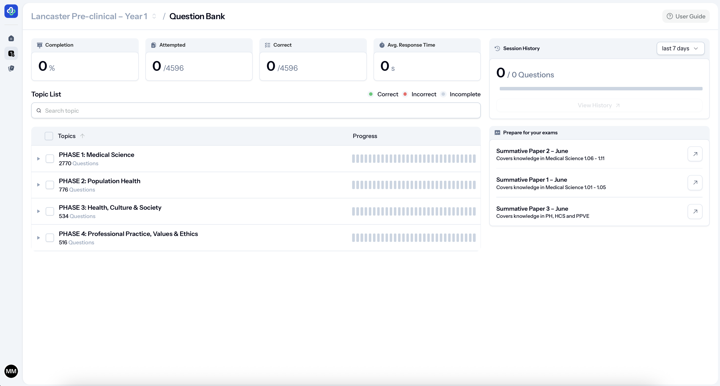 The question bank includes a feature that allows you to filter questions based on specific parts of the curriculum. So, whether you’re revising for the formative Medical Sciences Paper in January or the summative Population Health (PH), Health, Culture and Society (HCS), and Professional Practice, Values, and Ethics (PPVE) Papers, you can choose which topics to focus on.