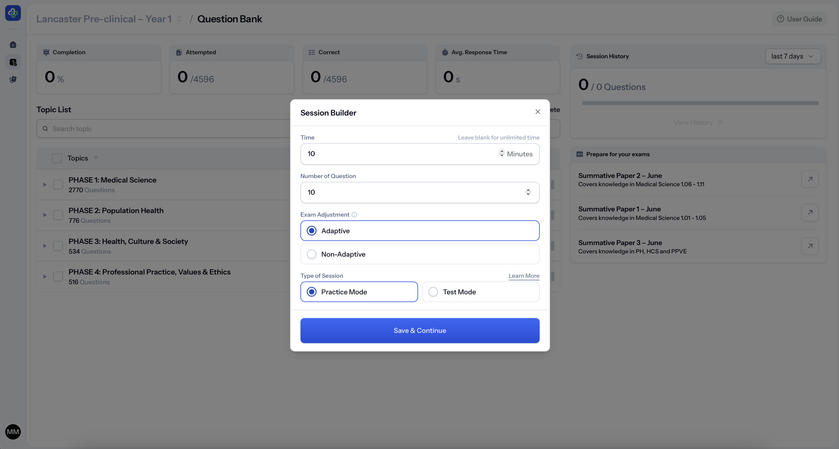 You can work module by module, choose how many questions you want to answer, and target specific topics as your exams approach.