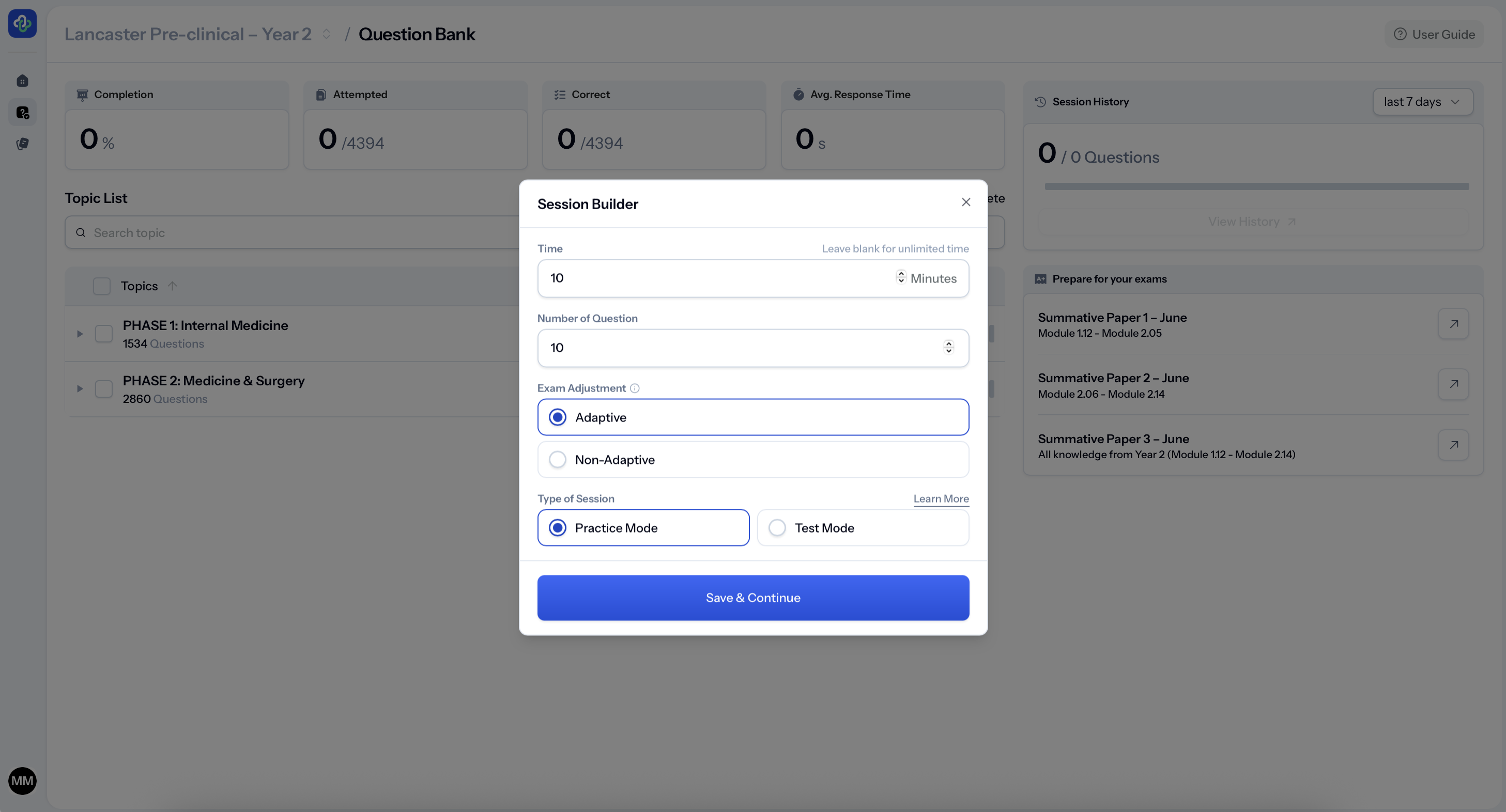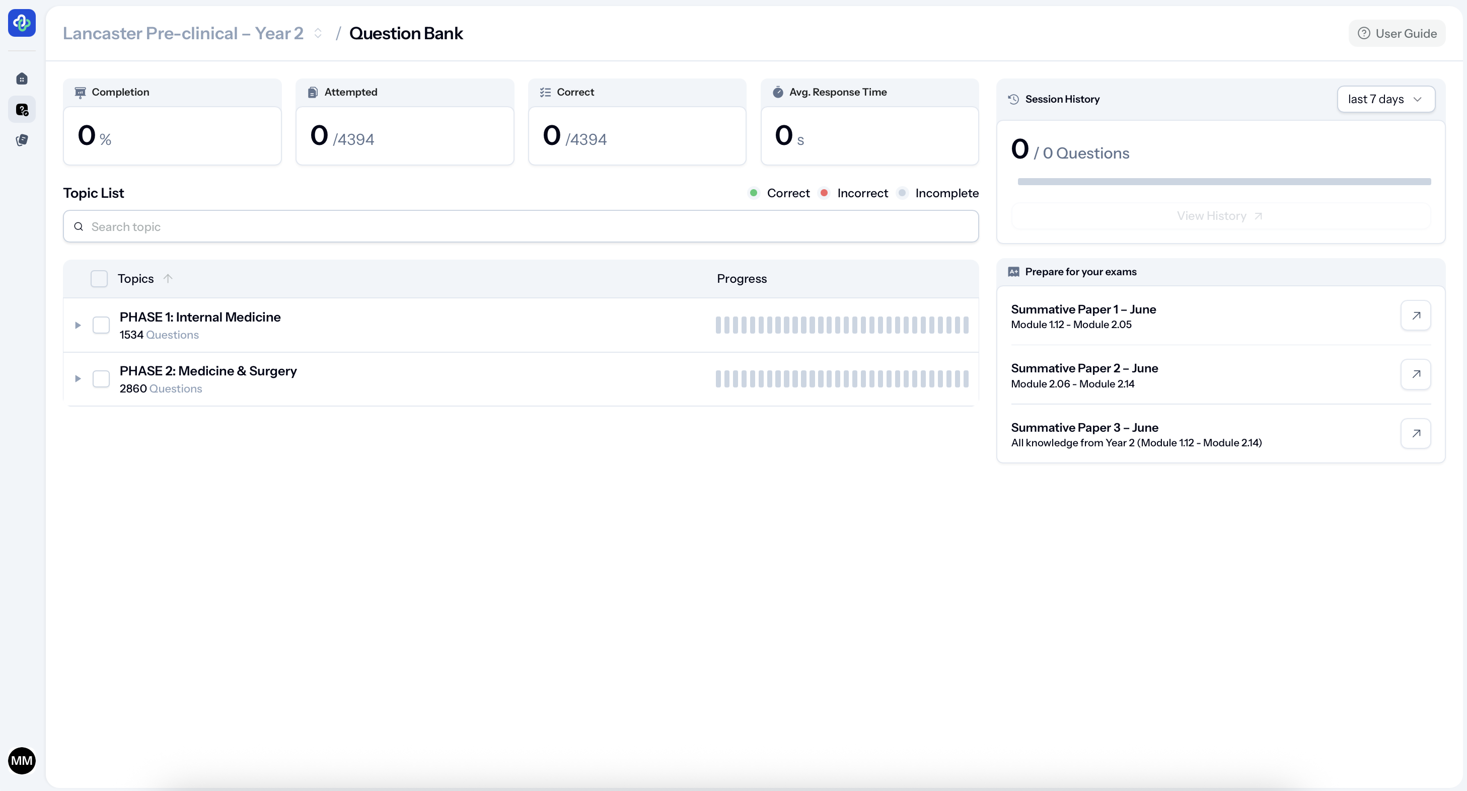 You can work module by module, choose how many questions you want to answer, and target specific topics as your exams approach.