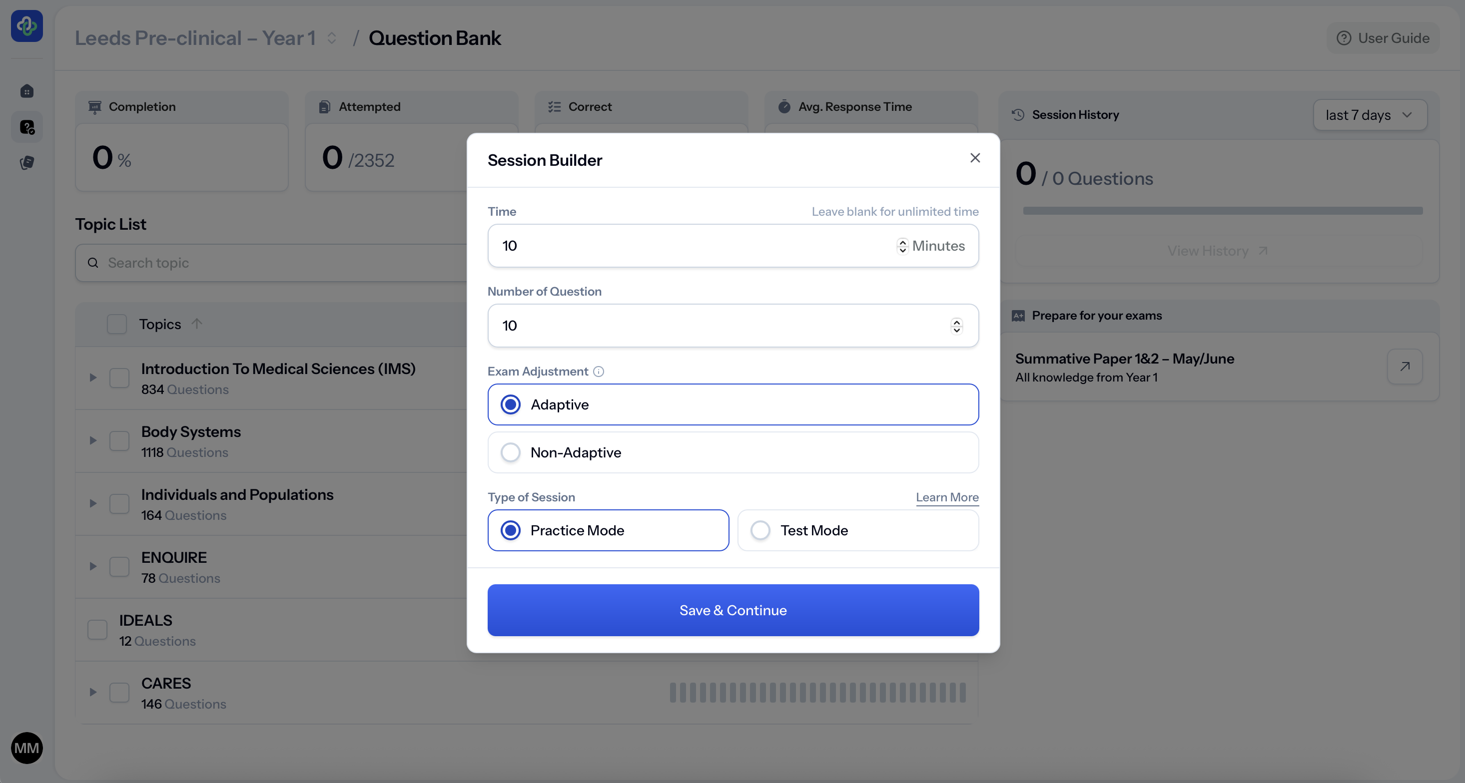 You can work module by module, choose how many questions you want to answer, and target specific topics as your exams approach.
