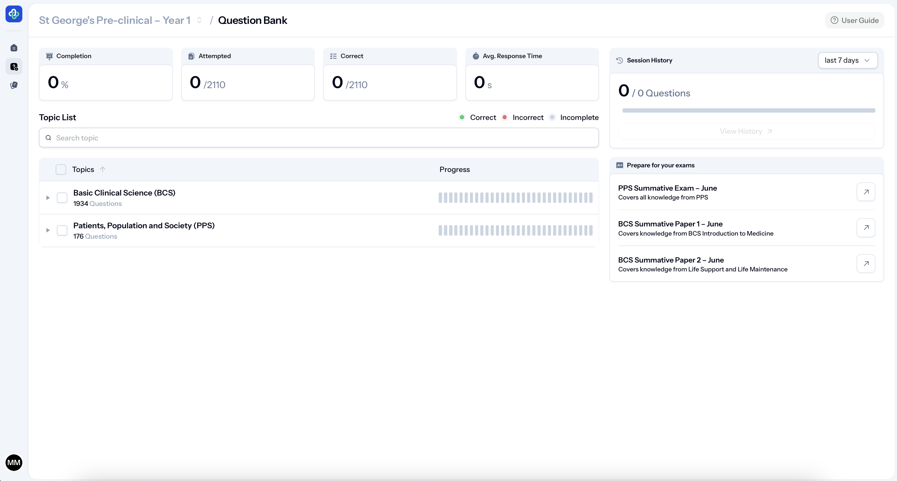The question bank includes a feature that allows you to filter questions based on different topics. So, whether you’re preparing for your formative Introduction to Medicine Paper in December or your Patients, Populations & Society summative exam in June, you can narrow your focus and enhance your revision.