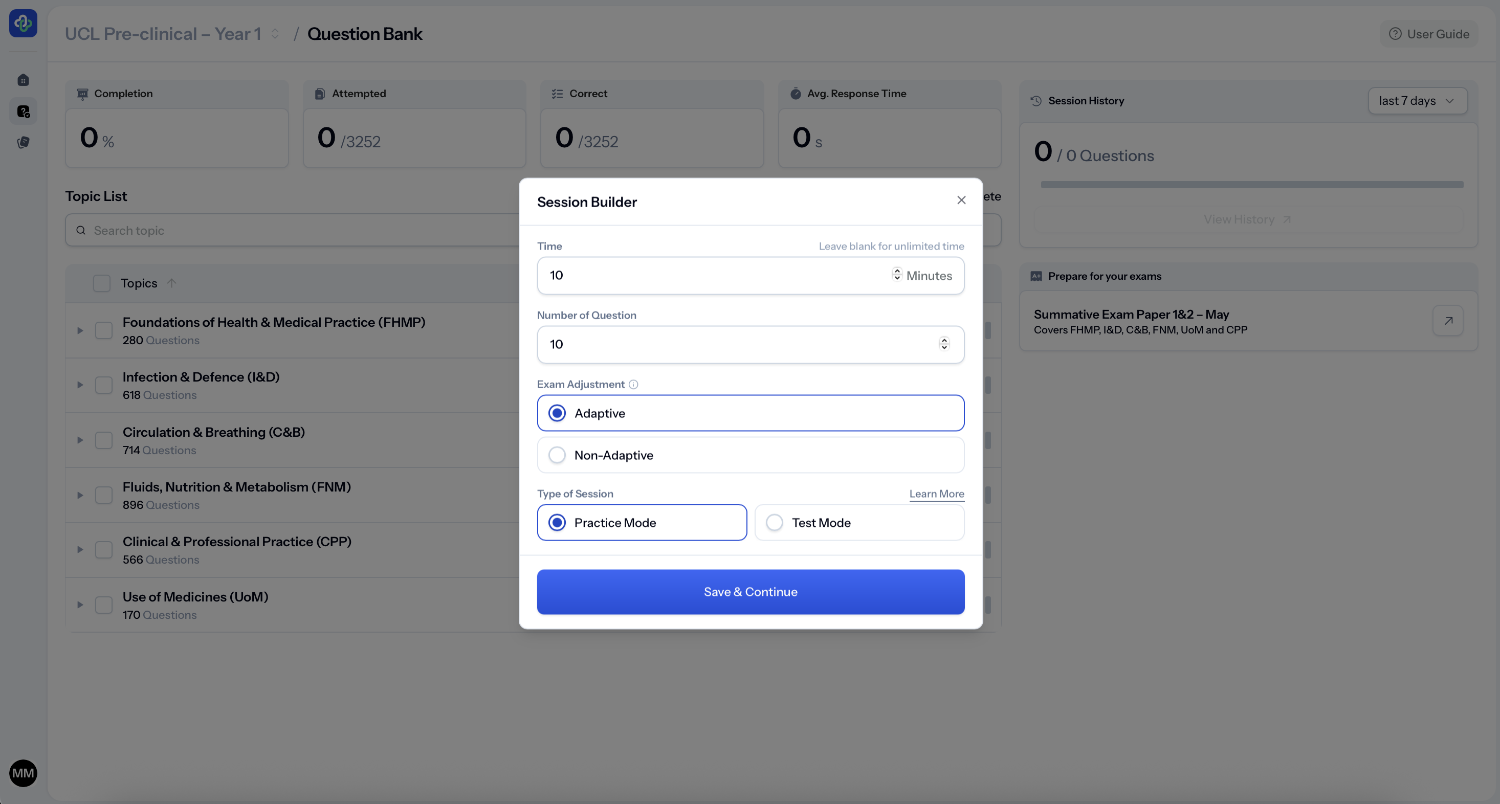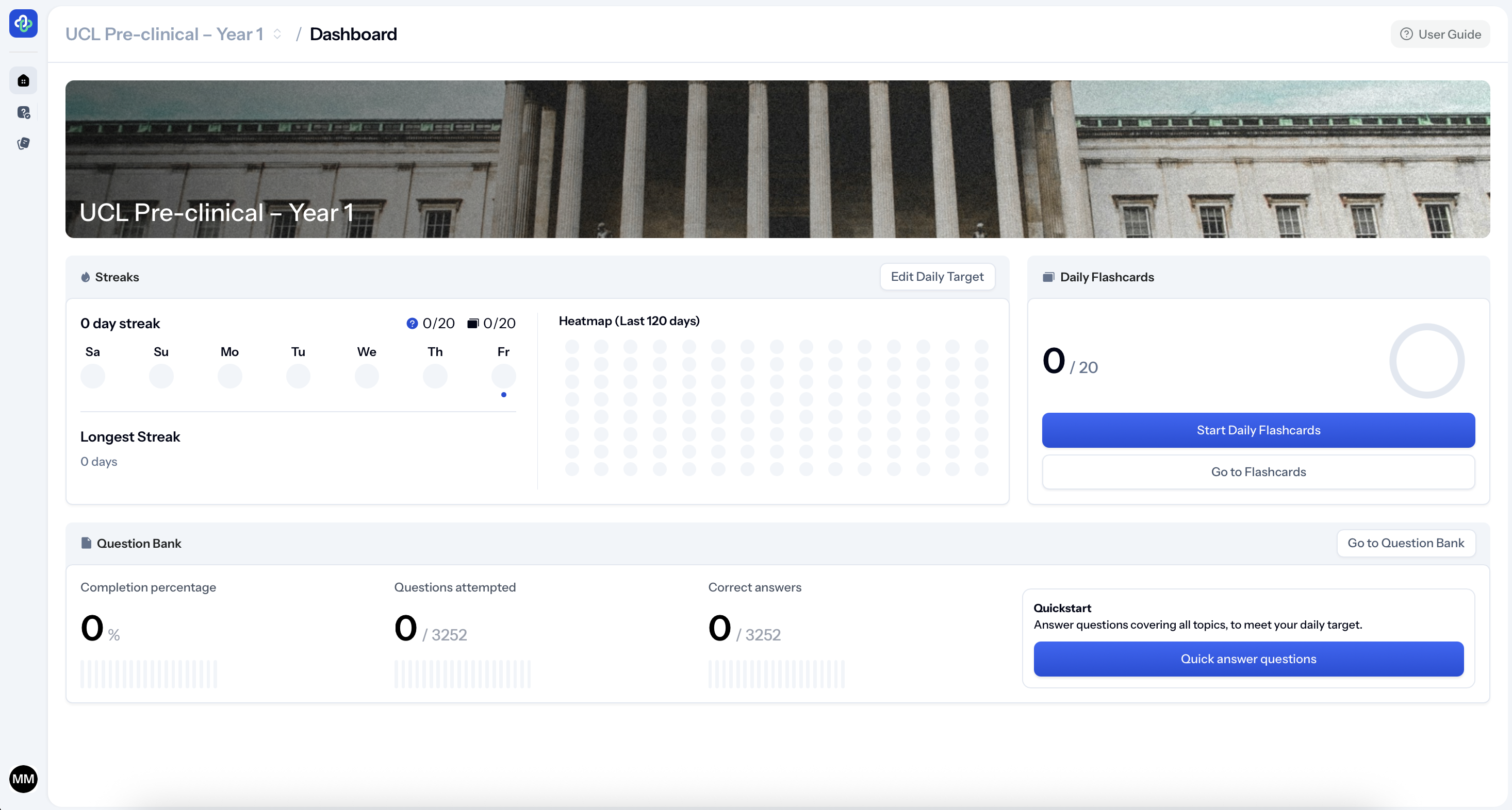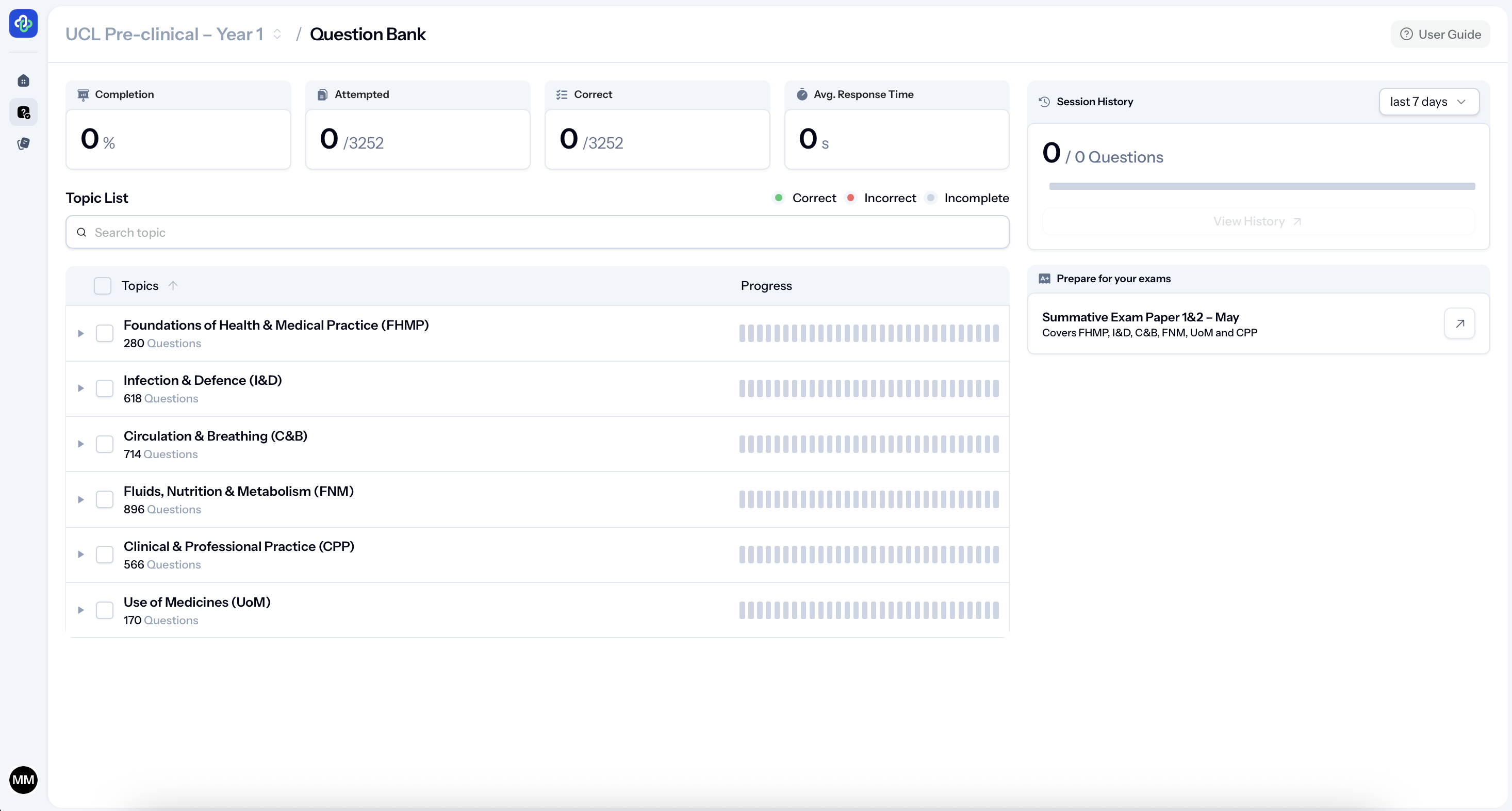Strong performance in your UCL Medical School Year 1 exams comes from consistent revision and actively engaging with your course material. Medibuddy’s Question Bank provides over 3,200 syllabus-aligned questions, giving you the chance to practise applying your knowledge and identify areas that need more work. By combining consistent study with good time management and a variety of revision strategies, you’ll cover all modules thoroughly and build the foundation needed to succeed in your exams.