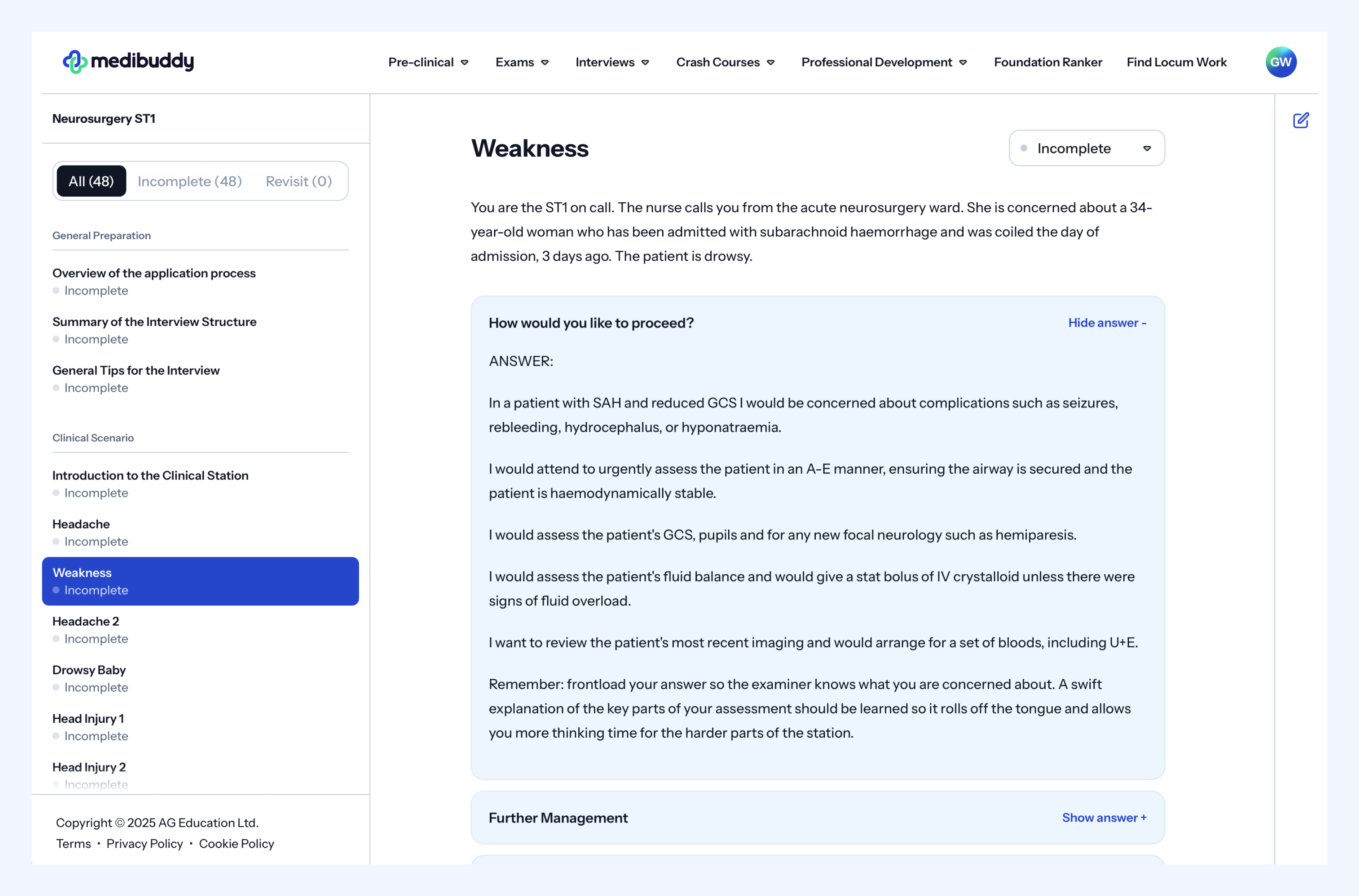 The most effective preparation is practising realistic scenarios that mirror what you’ll face in the interview. Medibuddy’s Neurosurgery ST1 Question Bank includes over 40 tailored scenarios across all station types, helping you structure answers confidently and refine your approach under timed conditions.