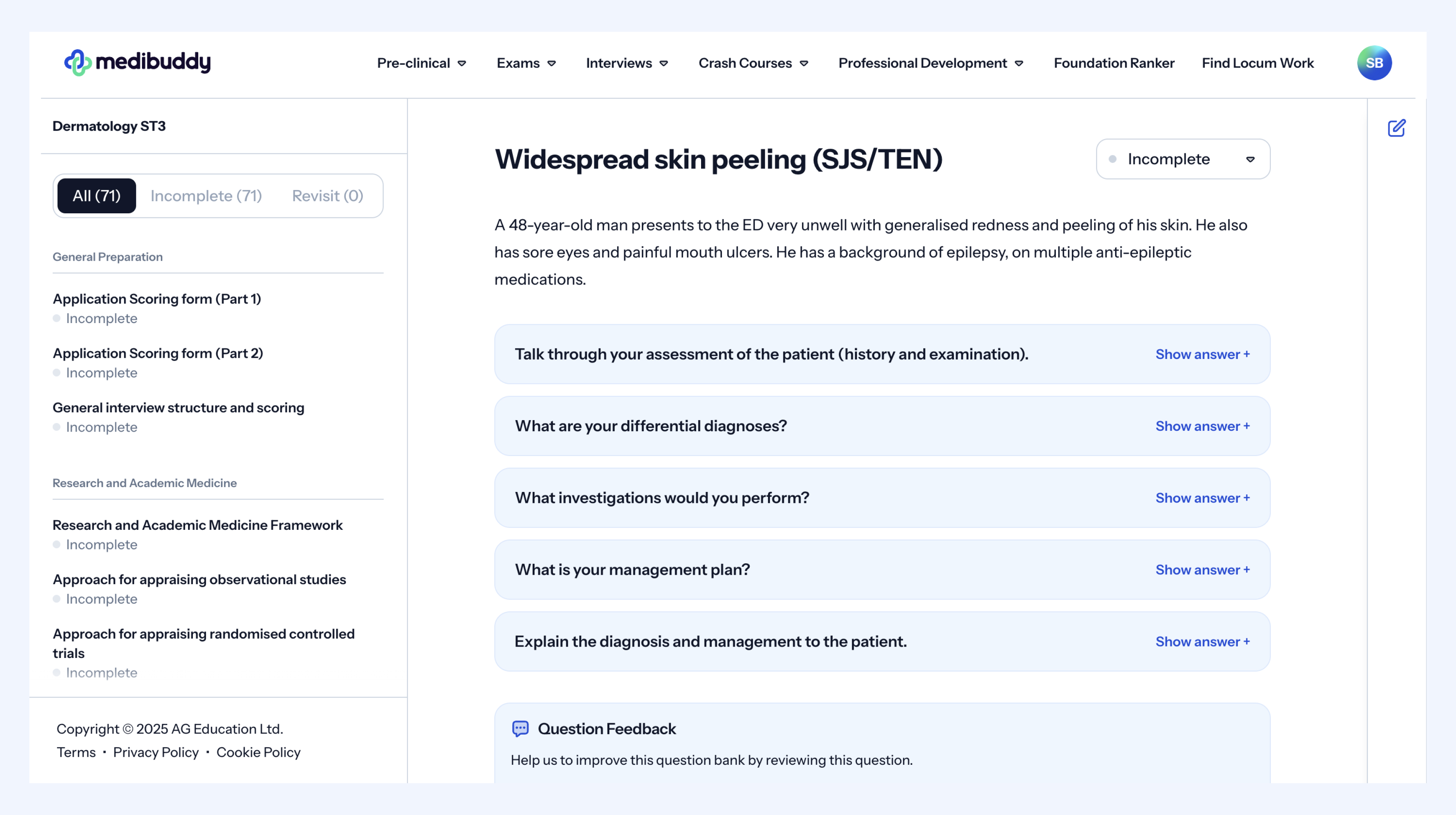 An example of this from the Medibuddy Dermatology ST3 interview question bank can be seen below: