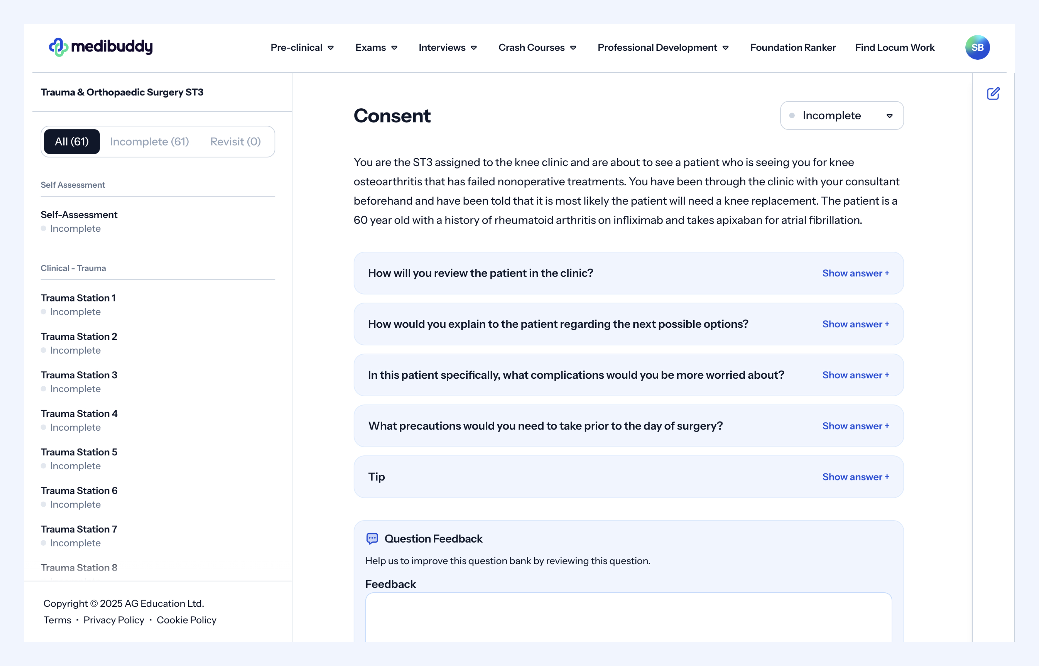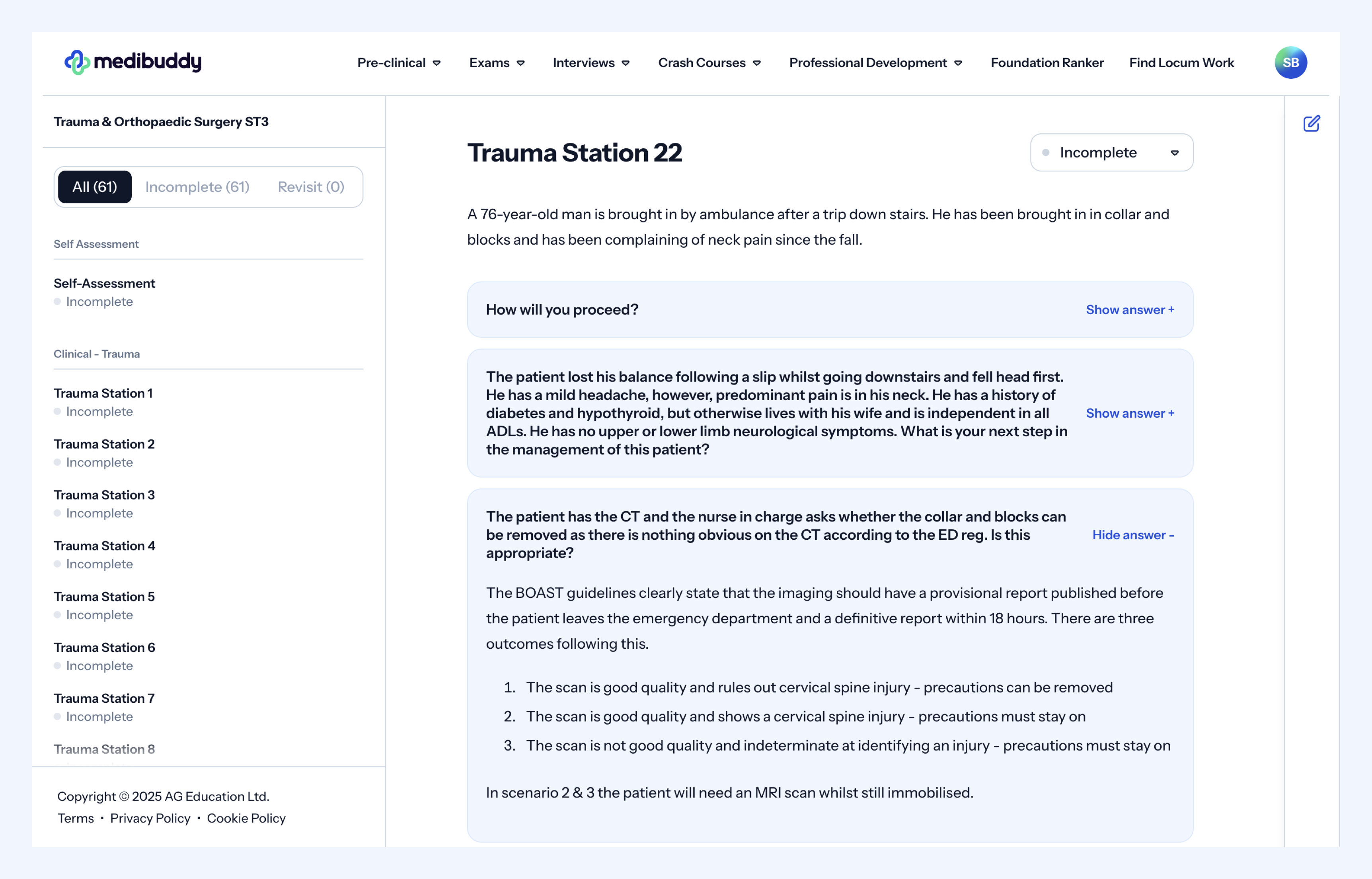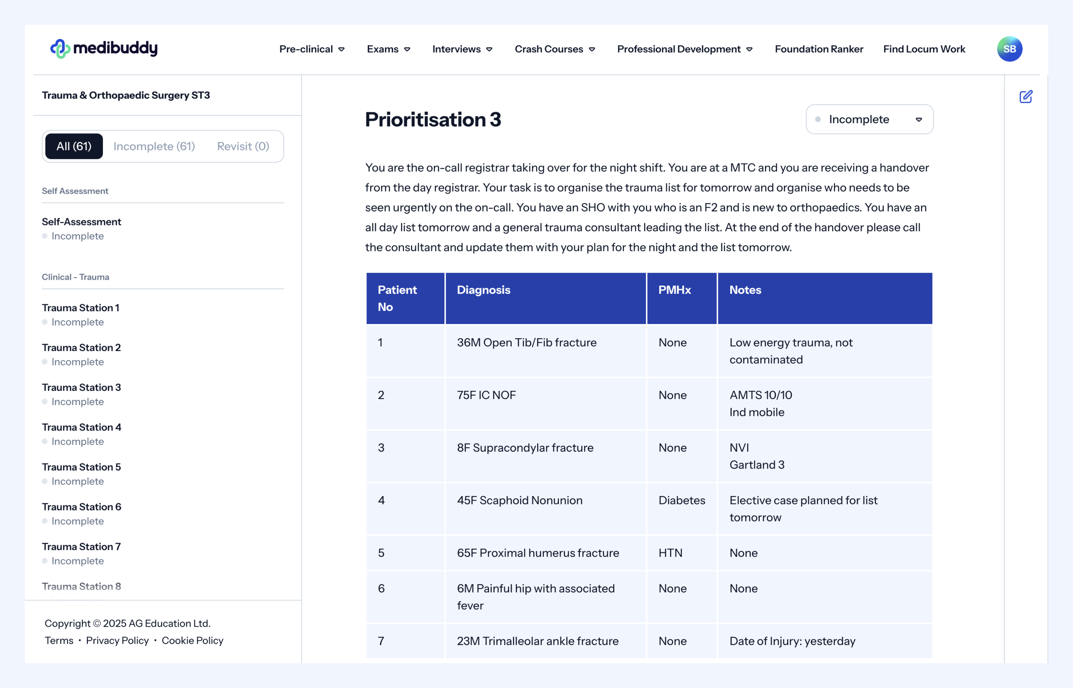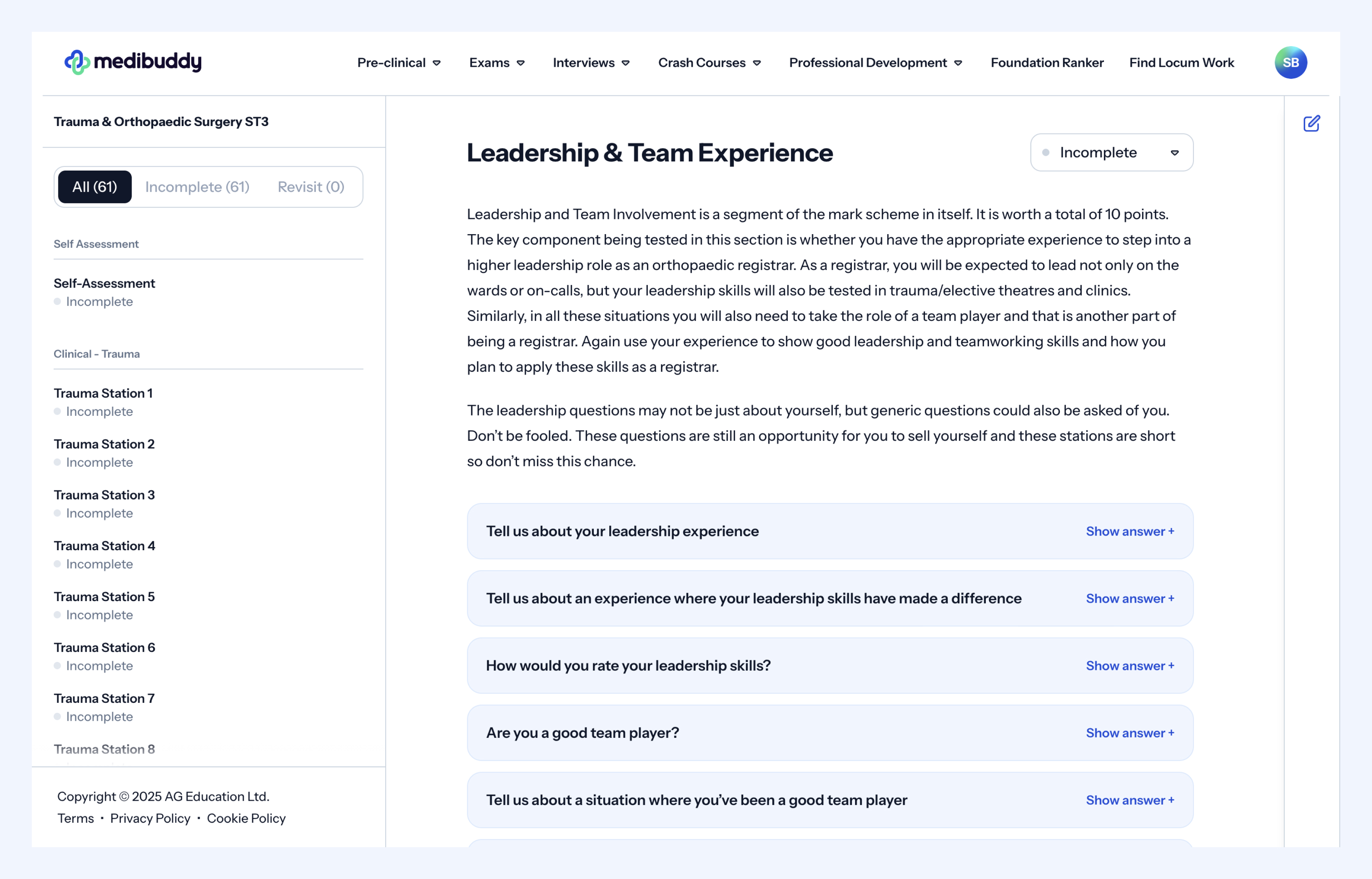 When preparing your application, we recommend ensuring you are familiar with the self-assessment scoring guidance and the application handbook. We’ve also designed the Medibuddy Trauma and Orthopaedic Surgery ST3 Interview Question Bank with a broad range of questions covering all elements of the interview and detailed explanations to help you succeed. You can find out more about our new T&O ST3 interview question bank here.
