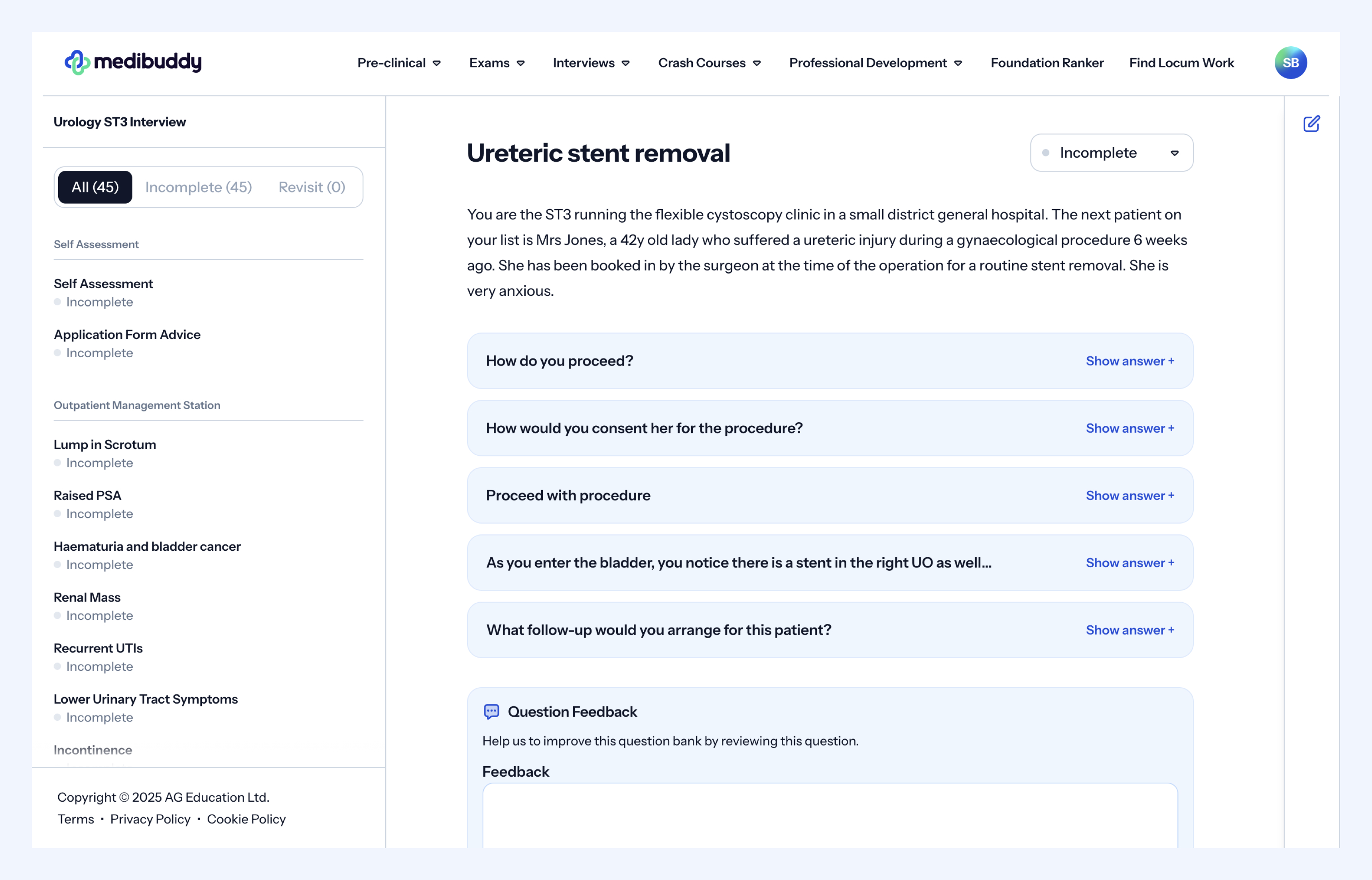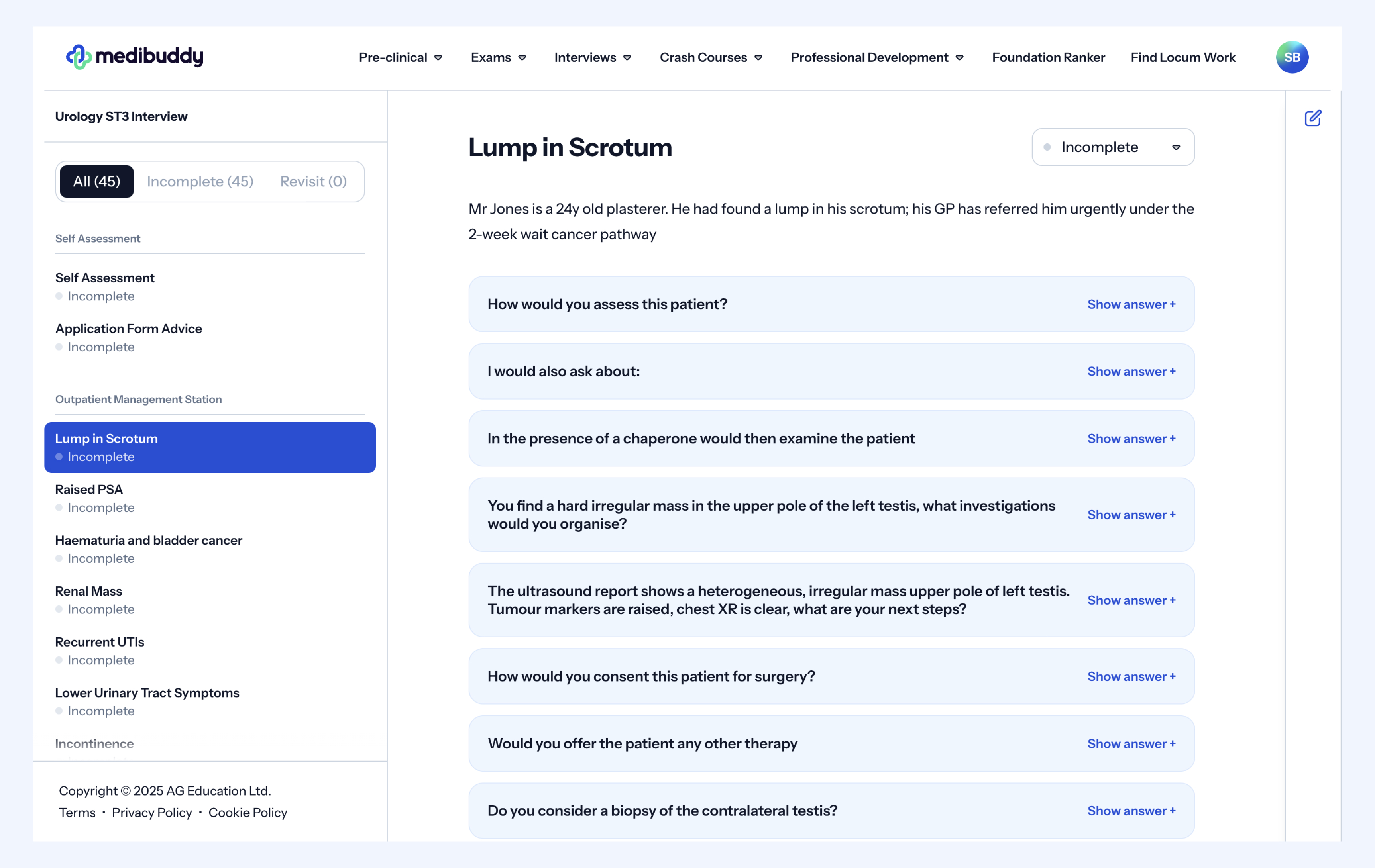 You will be presented with a scenario and asked multiple questions in regards to your approach. Here is an example of a Urology interview skills scenario from our question bank, to give you an idea of what to expect.